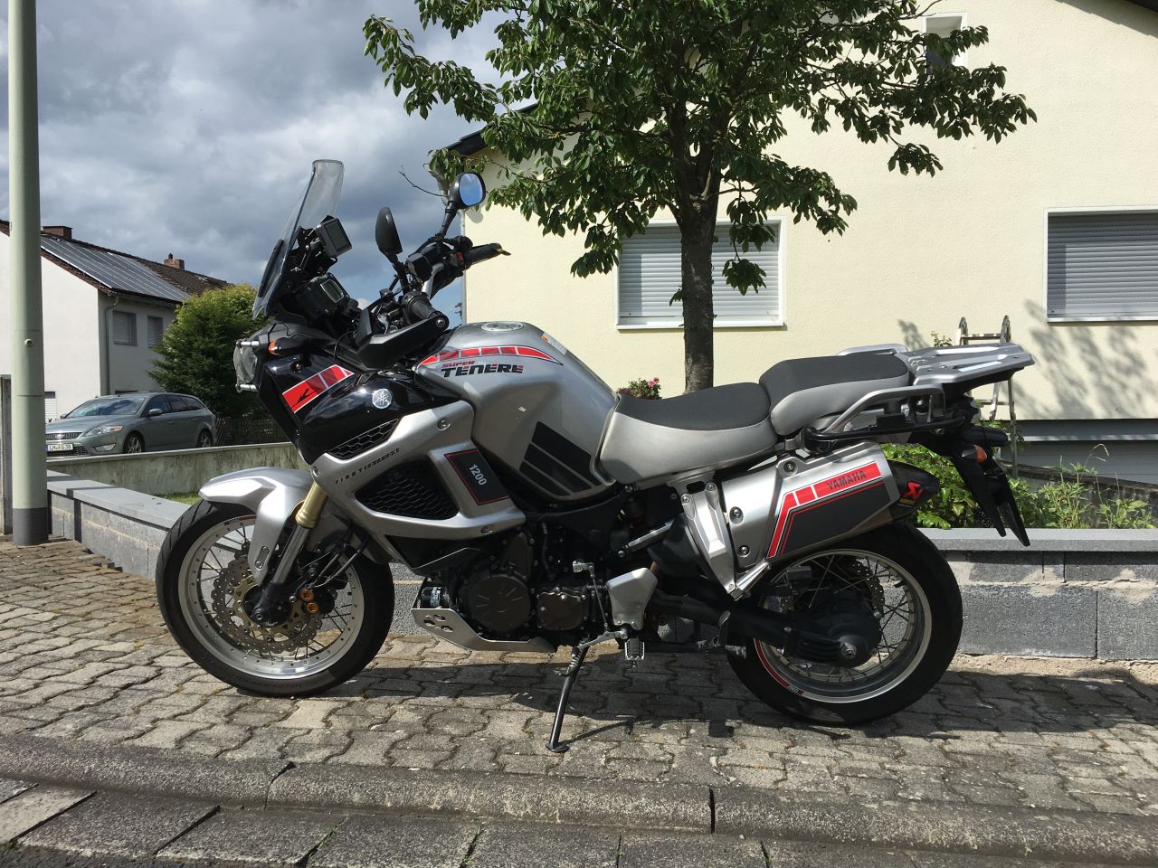 Ich habe mit erst mal einen roten WC-Aufklebersatz gekauft und wieder ein wenig Farbe ins Spiel gebracht. Nur den Super-Tenere-Schriftzug mußte ich auf den Tank versetzen, auf dem Seitenteil schaut schwarze Schrift auch schwarzem Untergrund nicht sehr prickelnd aus