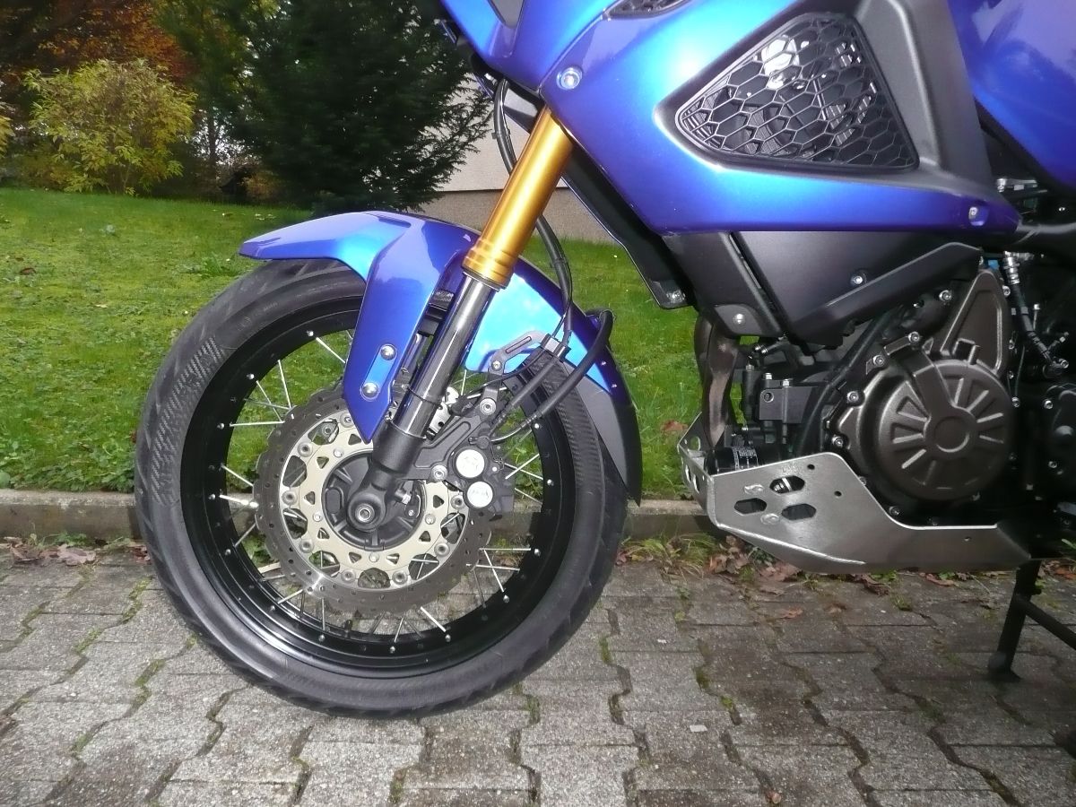 Ich möchte keinen Hinweis kleinreden. Doch was war da los ? Schaue ich mir die Situation von der Seite an und sehe, wie bei voll ausgefederter Gabel OTR-Verlängerung und Yamaha-Motorschutz - den XT-Freunt auch dran hat - zueinander stehen, dann kann ich in dieser Kombination keine Kollisionsgefahr zwischen diesen beiden Teilen erkennen.