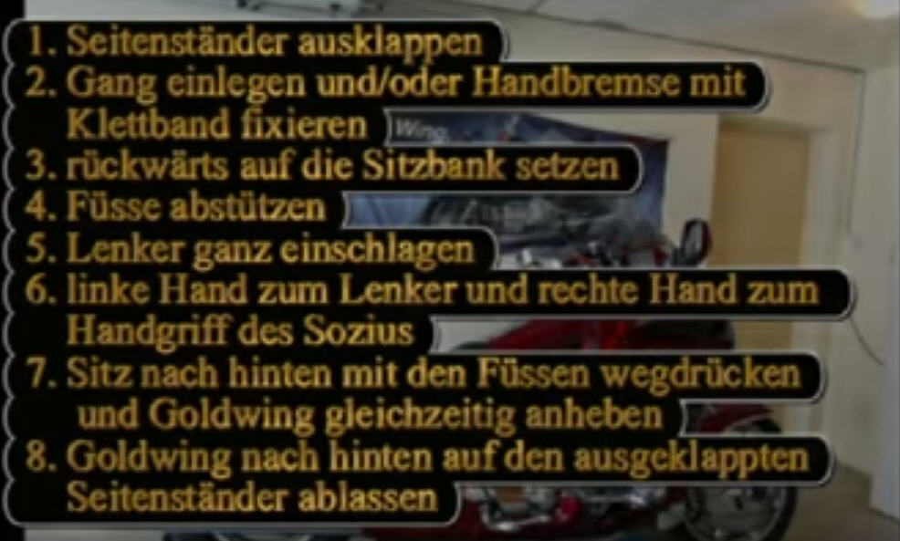 Lege die Goldwings auf den Videos, die dort nur gut 45° zur Seite liegen, mal so am Straßenrand ab wie dieSunshine hat geschrieben: Mit dieser Methode kann ich mich überhaupt nicht anfreunden. Das probiert mal mit einer schweren Maschine