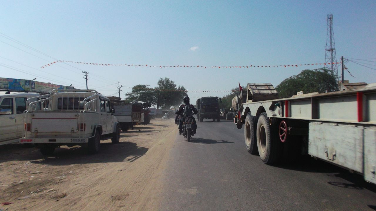 Die Ortsdurchfahrten sind oft eng, wenn sich zwei LKW begegnen fahren wir irgendwie vorbei, mal zwischen den LKW mal links durch den Sand.