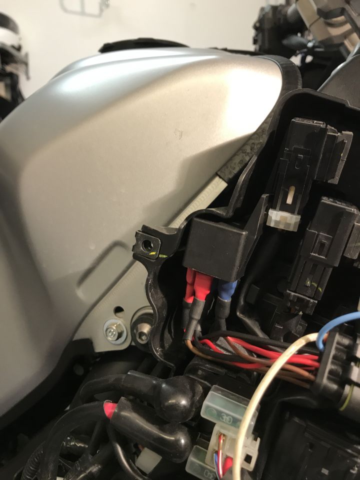 Die Speisung habe ich vom 3-poligen Stecker, der für die Original-Zusatzscheinwerfer ist, genommen. Weil da auch noch Navi und Stromversorgung des Tankrucksacks dran ist, hab ich vor längerem ein 3-fach Stecker für den 3-poligen Stecker gebaut: