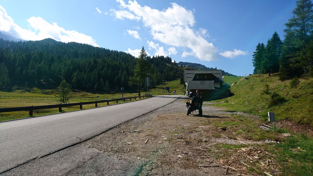 Oben auf dem Pass haben wir eine kurze Pause eingelegt um dann weiter zu fahren Richtung Pustertal um dort zunächst den Staller Sattel zu erklimmen. Wir hatten Glück und erreichten die Ampel buchstäblich in letzter Minute: um Punkt viertel vor passierten wir sie und konnten gleich durchstarten. Der Pass ist recht anspruchsvoll mit seinen engen Kehren und der schmalen Straße. Gut dass man nicht mit Gegenverkehr rechnen muss. Dann gings wieder ins Tal und weiter über Lienz und das Gailtal weiter über die beiden oben genannten Pässe nach Moggio Udinese, unserem heutigen Etappenziel. Die letzten Kilometer waren noch einmal recht anspruchsvoll, nicht wie erwartet ein Einfaches dahin rollen im Tal. Gegen halb sechs waren wir dann am Hotel. Für heute waren das aber wirklich genug Pässe und Kurven, das reicht für einen Tag. Morgen gibt es wieder genug Kurven, unter anderem haben wir den Mangart auf dem Zettel. Das heißt, Morgen fahren wir nach Slowenien.
