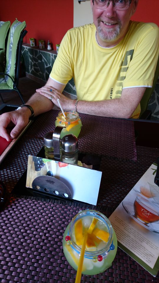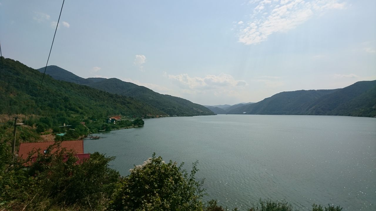 Später dann war das Ufer von Hotels und Pensionen gesäumt, ein bisschen wie früher in Jugoslawien die Küstenstraße. Der Donaudurchbruch war dann beeindruckend, auch weil der Fluss vorher fast wie ein See wirkte. Leider gab es keinen schönen Aussichtsplatz. Einen guten Kilometer weiter liegt das Kloster und kurz danach folgt das in den Felsen geschlagene Antlitz eines alten Herrschers. Hier war Halligalli wie am Ballermann! Via Intercom haben wir dann kurz besprochen, dass wir lieber weiterfahren und auf den Trubel bei 35 Grad verzichten. Dann gings es bei Orschowa wieder ins Innenland Richtung Herkulesbad zu unserer Unterkunft. Da Peter diesmal den Wegpunkt nicht genau gesetzt hat waren wir zunächst etwas orientierungslos. Aber Fragen kann helfen und so sind wir dann doch beim Hotel angekommen. Nach dem Reinfall gestern wieder eine feine Unterkunft, tolle Zimmer, nette Wirtsleute und sogar mit Pool und gekühlten Getränken. Zum Essen waren wir aushäusig, es gab Spaghetti und dazu jeweils einen Salat. Die Krönung war die selbstgemachte Limonade, davon brauchten wir jeweils 2 Gläser gegen den Durst, einfach lecker! Morgen wird’s eine kurze Etappe von ca. 130 km, eventuell noch teilweise geschottert, aber es wird kein langer Fahrtag werden. Also auch etwas länger schlafen