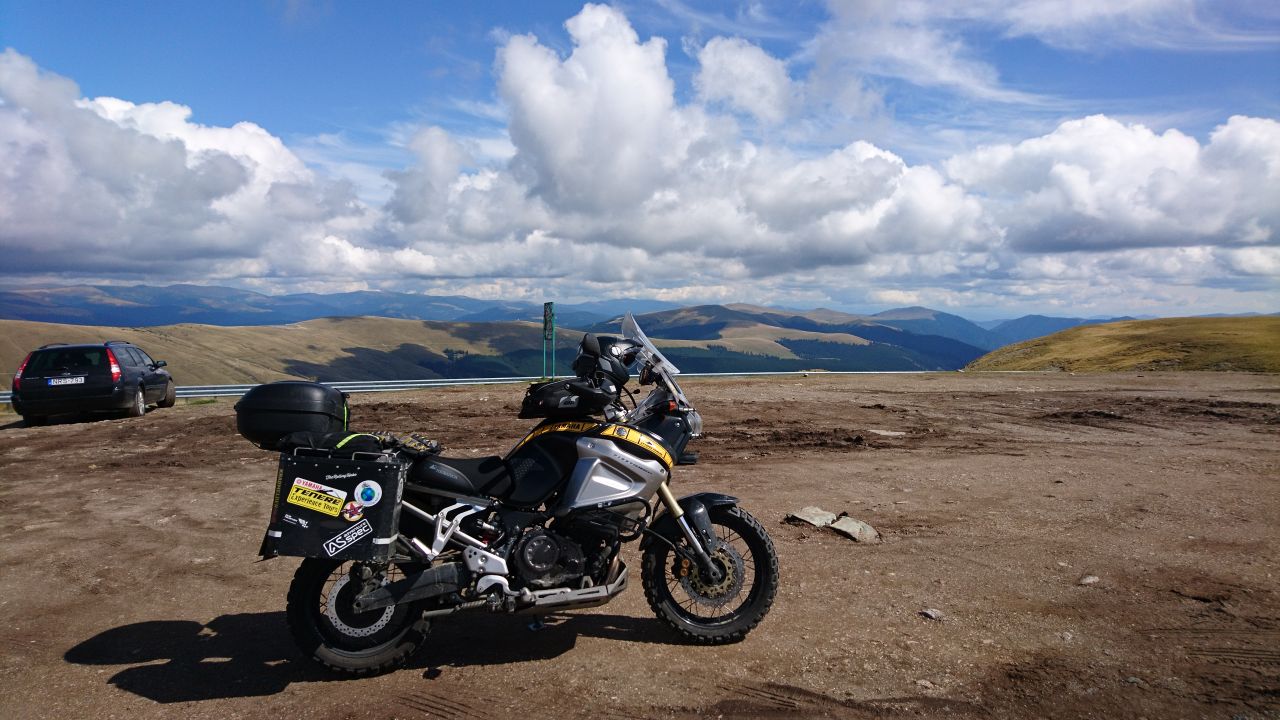 Heute stand das Highlight unserer Reise auf der Agenda, der Transfaragas! Doch zunächst war frühstücken angesagt. Nicht das Beste, aber es war okay als Grundlage für die Fahrt. In der Nacht hatte es noch ordentlich geregnet, aber mittlerweile wieder trocken, aber im Vergleich mit den letzten Tagen etwas kühl. Also aufgesattelt und ab die Post. Zuerst ging es durch die Stadt und dann raus auf die Landstraße. Gute 30 km waren es bis zur Abzweigung zum Transfaragas. Von der Abzweigung au konnten wir schon die wolkenverhangenen Berge sehen. Hmh, ist wohl besser schon mal anzuhalten und die Innenjacken anzuziehen. Gesagt getan. Dann ging es aufwärts, zunächst noch etwas weiter geschwungene Kehren, aber dann ging es zur Sache. Enge Radien und steile Anstiege bei feuchter Straße sowie die üblichen Verkehrshindernisse wie PKW und Kleinlaster forderten unsere ganze Aufmerksamkeit. Trotzdem konnten wir immer wieder einen Blick auf die wilde und grandiose Landschaft werfen. Nach diesen ersten Kilometern kann schon sagen, dass der Transfaragas ganz oben in der Pässe-Liga mitspielt! Nach ca. einem Drittel des Anstiegs kamen wir an einem Ski-Ressort vorbei, wo trotz des eher schlechten jede Menge Touris unterwegs waren. Das ist nichts für uns, daher ging es noch ein paar Kehren bergauf, bevor wir einen Stopp einlegten. Was für ein Ausblick. Das Tal aus dem wir kamen war gut einzusehen und in der Ferne lag die Ebene im Sonnenlicht. Die raue Schönheit des Passes kam hier richtig zur Geltung! Plötzlich hörten wir einen Hubschrauber. Der flog kurz ins Tal hinein und drehte dann wieder Richtung Ebene. Es war leider ein moderner Eurocopter, mir wäre ein Mi 8 lieber gewesen.