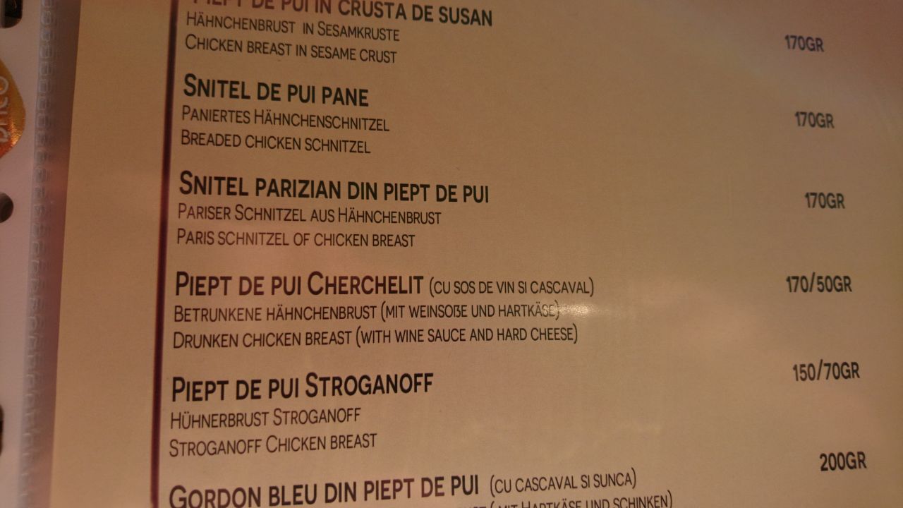 Der Blick in die Speisenkarte überraschte uns mit deutschen Menünamen, was uns das Bestellen leicht machte. Ich entschied mich für das „Betrunkene Hühnchen“ und Fritze nahm „Muschi Tiganesc“. Nein, das Zeug heißt wirklich so, und beim Studieren der Speisenkarte konnten wir uns das Grinsen nicht verkneifen. Zu Trinken nahmen wir das hier weit verbreitete Ciuc Radler, ein trübes Biermixgetränk, welches wir gleich beim ersten Mal zu unserem Lieblingsgetränk ernannten.