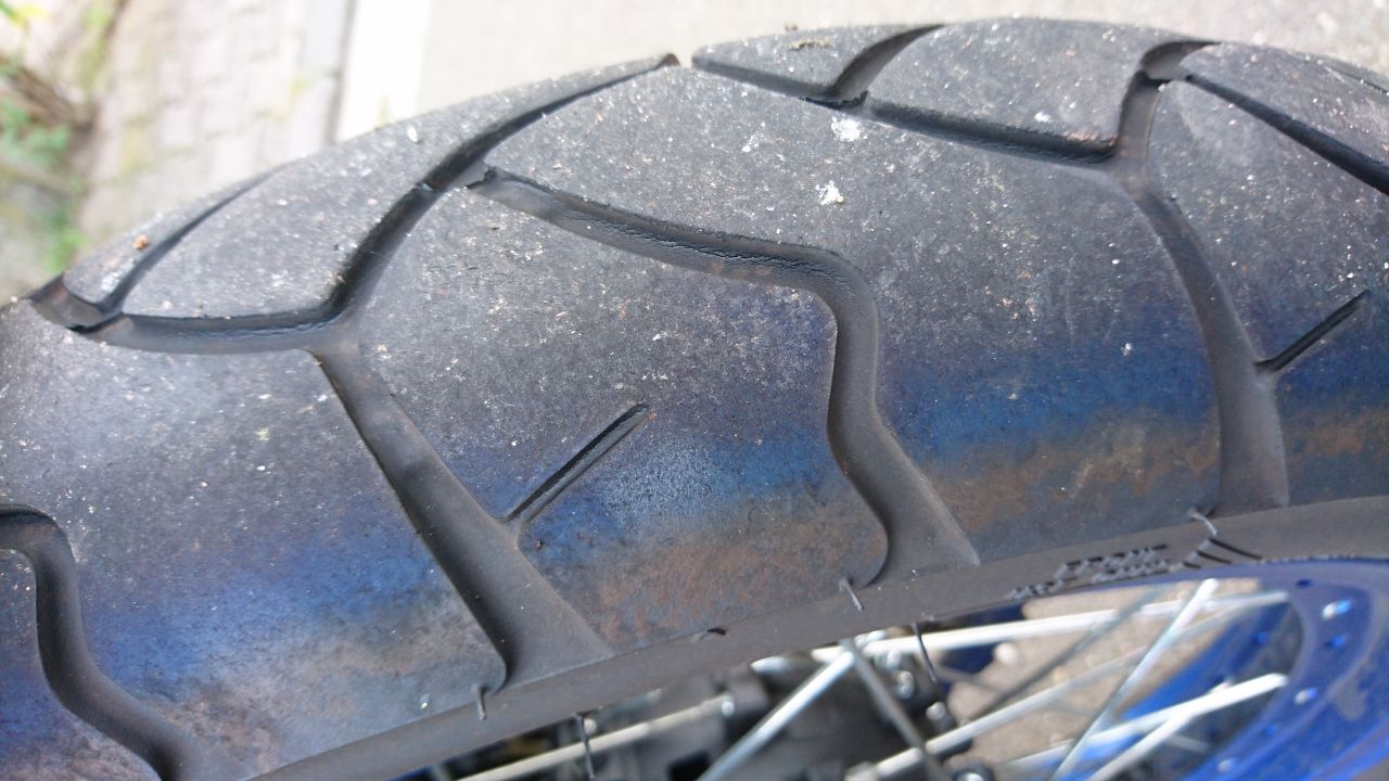 Das sind angeblich Reste von herausgetretenem Weichmacher. Sieht man wenn der Reifen zuerst richtig warm geworden ist und dann recht schnell erkaltet ist. Also eher ein Frühjahr/Herbst-Phänomen weil es in der Nacht durchaus noch bzw. schon recht kühl wird. Die Rückstände sind auch schnell wieder "weggefahren" und dadurch angeblich auch unkritisch. Wobei ich selbst schon mal Reifen (Dunlop Road Max glaub ich) deswegen frühzeitig entsorgt habe weil er nach jeder Fahrt komplett blau wurde und ich meine, am nächsten Tag die ersten 15km ziemlich rutschig. Kann aber sein, dass es an den niedrigen Temperaturen lag bei denen ich fahren musste, ich hatte damals kein Auto.