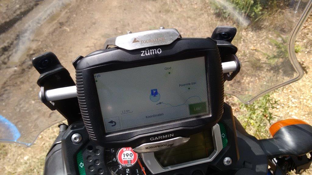 Ja Jungs, das war schon eine unvergessliche Aktion bis die Dicke wieder aus dem Schlamm war. Eines der Highlights unseres Urlaubs. Mein Kumpel wähnte sich auf der linken Seite auf der besseren Seite (was auf dem ersten, der folgenden Bilder auch so aussieht, weil links trocken. Unten war es dann aber bereits zu spät. Wahrscheinlich war er der Auffassung, dass die Pfütze nicht so tief ist. Schuldzuweisungen helfen aber in solchen Momenten auch nicht viel weiter. Gefühlt verbrachten wir drei Stunden in der Wildnis bis Hilfe nahte. Wir versuchten zwar das Wasserloch durch eine mit Stöcken gegrabene Ablaufrinne trockenzulegen, was auch einigermaßen klappte, es lief aber immer wieder vom Hang her Wasser von zwei Seiten nach. Hätten wir einen Klappspaten dabei gehabt - aber wer hat schon beim Moppedfahren einen Spaten dabei? -, dann hätten wir den Schlamm rausgraben können und hätten es vielleicht ohne fremde Hilfe geschafft. Nun ja, ich habe unserem rumänischen Ansprechpartner George über WhatsApp das Bild von meinem Navi geschickt, damit er sich in etwa orientieren konnte, wo wir stecken, im wahrsten Sinne des Wortes