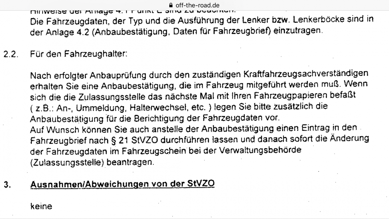 Da ich auch noch eine Lenkererhöhung verbaut hatte, hat der Herr vom TÜV gleich die ganze Kombo eingetragen.