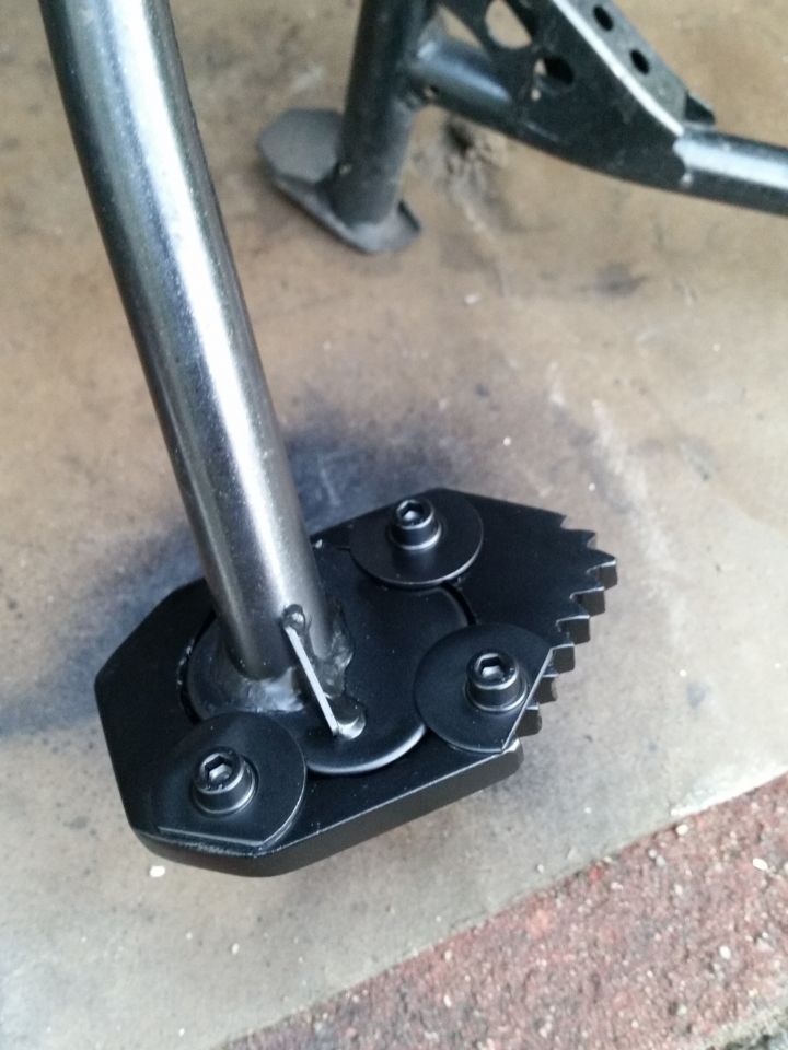 Um solche Unterlagen am Seitenständer ging es hier schon öfter - wer's mag. Ich möchte nicht tausend Dinge an mein Mopped bauen, von denen jedes bei irgendeiner Gelegenheit vielleicht nützlich ist. Die 10 mm unter dem Seitenständer verlagern das Problem nur, denn das Mopped steht damit steiler. Früher - viel früher ;) - nahm ich das Gerät vom Hauptständer, egal wie beladen es war, hielt es mit einer Hand am Lenker und mit - ich zitiere - Stechschritt war das Bein drüben. Dafür reichen meine Reflexe nicht mehr aus.