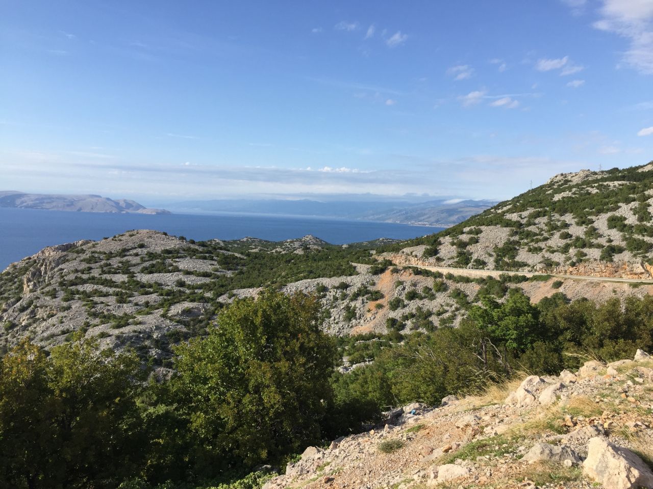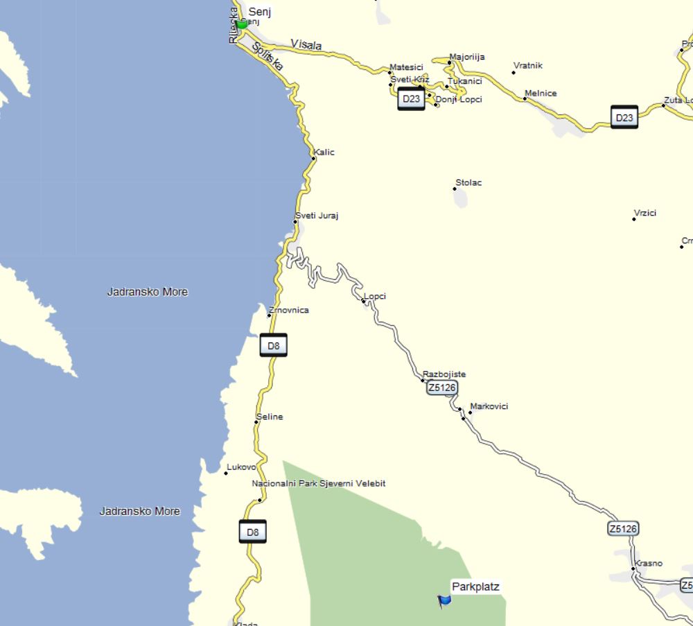 Die ersten 5 Minuten dieses Videos zeigen Ausschnitte von der Anfahrt ab der Grenze zum Aussichtpunkt: http://youtu.be/sQN2Ef0oR6U Über Dubrovnik gibt es noch einen Aussichtspunkt, der aber leicht zu finden ist. Da gibt es nur eine Straße, die den Berg hoch geht. Und falls du etwas Schotter fahren willst und anschließend 30 Minuten zu Fuß den Berg hoch laufen willst, gäbe es noch diesen Aussichtspunkt. Südlich von Senj kann man über die Z5126 und L59133 in den Nationalpark Sjeverni Velebit fahren. Die Strecke von der Küste bis zum Parkplatz führt über 30km vom Meer hoch auf 1.520m. Die letzten 6km sind mautpflichtig und nicht geteert. Vom Parkplatz kann man noch auf den Gipfel des Berges (1.644m) steigen (Abzeig geht hinter eine Kneipe hoch) und man hat dann diese Aussicht auf Krk: