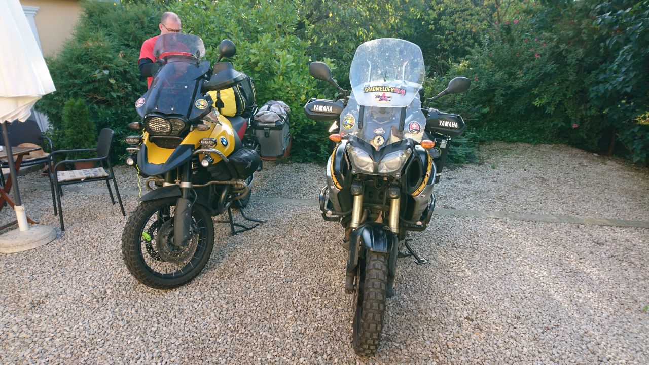 Wir haben die Wecker auf acht Uhr gestellt und sind dann langsam hoch. Unsere Wirtin hat sich dann bereit erklärt uns doch ein Frühstück zu machen (eigentlich Übernachtung ohne Frühstück), was super lecker war, es gab ein Omelett mit scharfer Salami und Schinken, dazu Weißbrot und Marmelade und Kaffee. Uns hat`s super geschmeckt und es war genau die richtige Grundlage für die Strecke nachher. Nach dem Frühstück gings ans Packen und dann die Moppeds auf dem Grundstück umdrehen und über die Bordsteinkante bringen. Auch das hat gut geklappt.