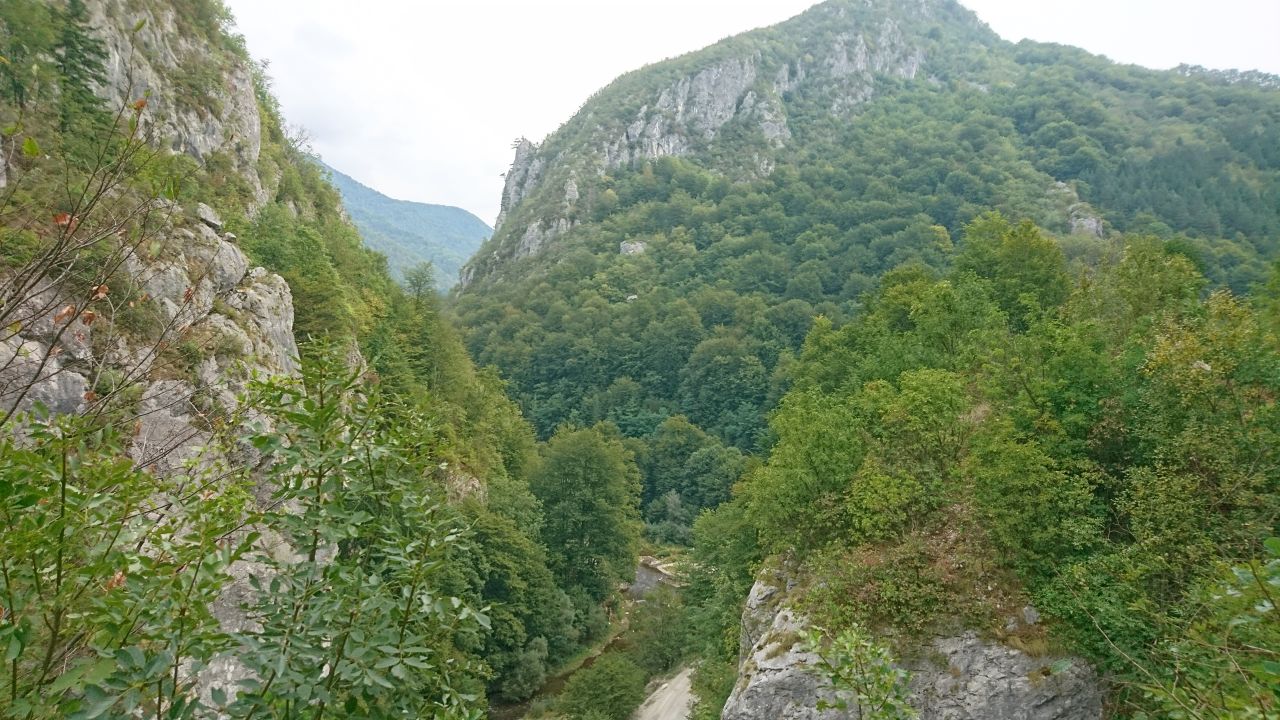 Wie Wolle weiter ober schon schrieb, wechselt die DN66A an der Landkreisgrenze Hunedoara von Schotter/Schlagloch/Schlamm schlagartig zu einer Strecke im Stil einer Bundesstraße mit beiderseitiger Schutzplanke, Leitpfosten und Beschilderung. Dann geht es erst einmal etwa 40 Kilometer durch eine felsige Schlucht, immer entlang dem Flüsschen Jiul de Vest. An manchen Stellen quetschen sich Straße und Fluss durch nicht einmal 20 Meter schmale Felsenschluchten – einfach herrlich, dort auf der fast menschenleeren Straße zu cruisen, zumal nach den zuvor erlebten Strapazen auf der Piste im Cernatal.