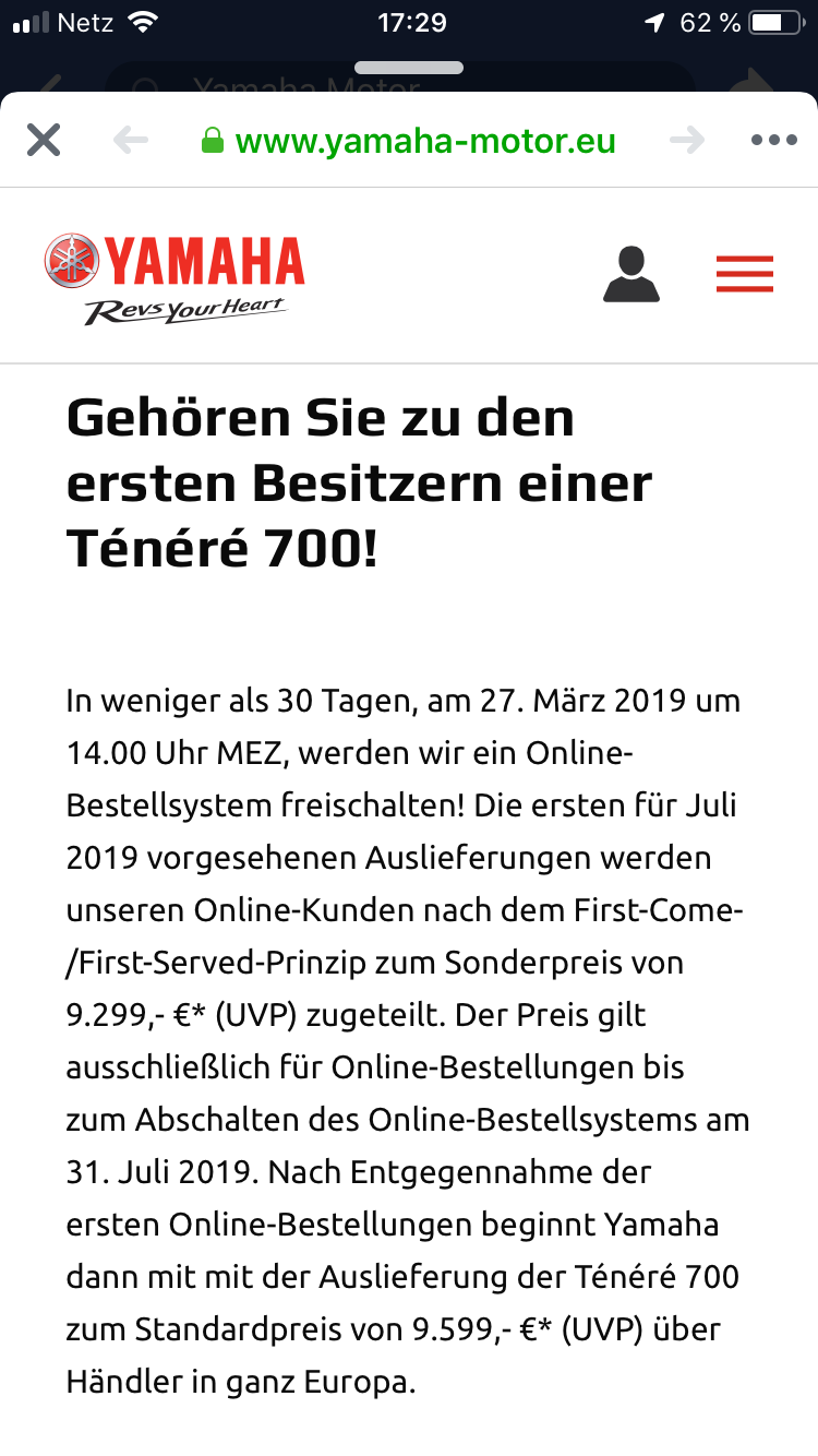 ja gerade erst gekauft. Die T7 war da schon auch in der engeren Auswahl, allerdings darf ich als Angestellter eh keine vorbestellen und wenn ich dieses Jahr nochmal fahren will, kommt eine T7 auch eher nicht in Frage. Die letzten Infos von Yamaha an uns besagten, dass die Auslieferung der vorbestellten Maschinen erst ab September oder gar Oktober beginnt.