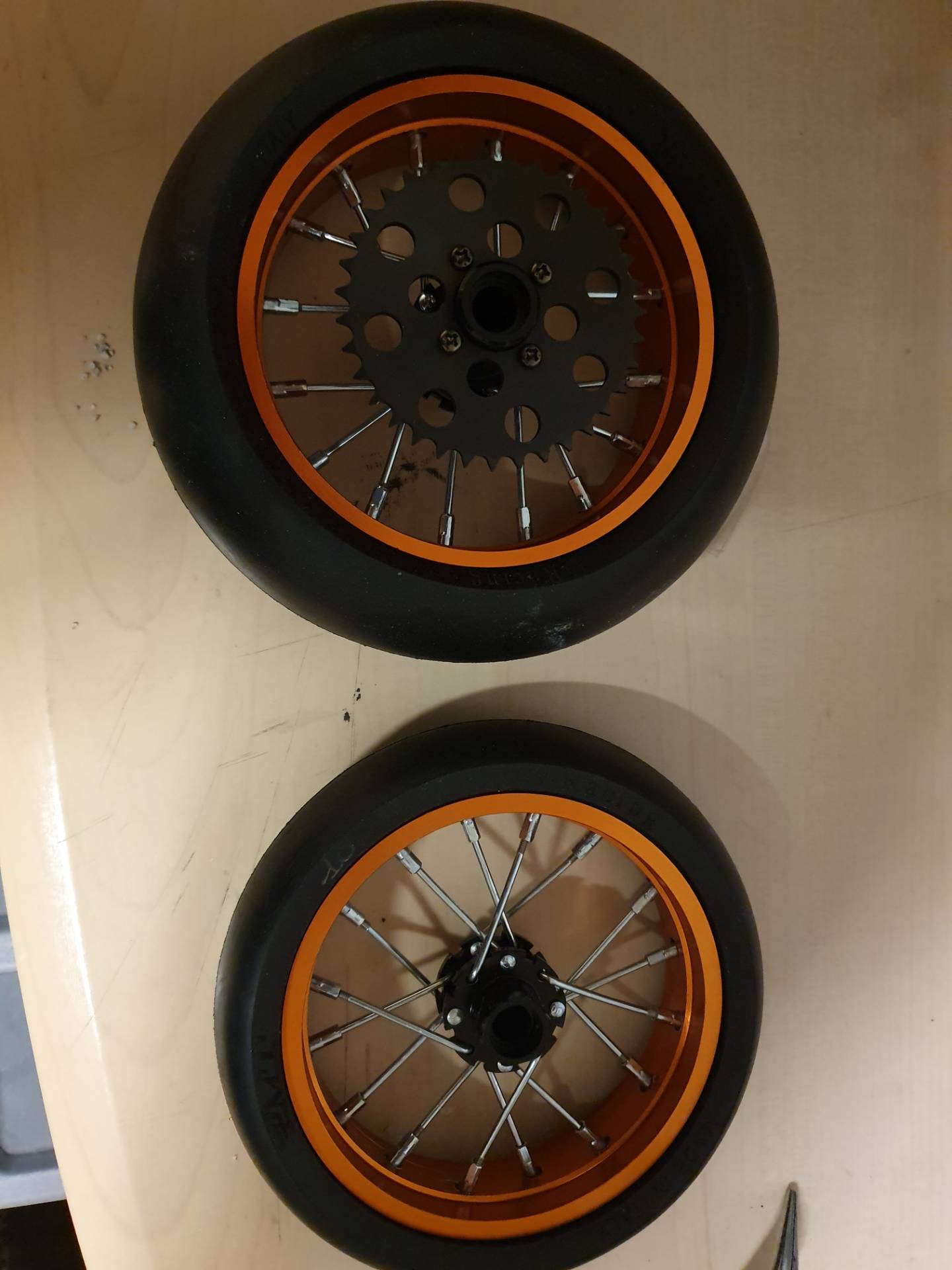 hallo hir noch ein paar Bilder und meine super moto Felgen frisch eingespeicht. und an meinem 1:5 Motorrad die neue Verkleidung angepasst