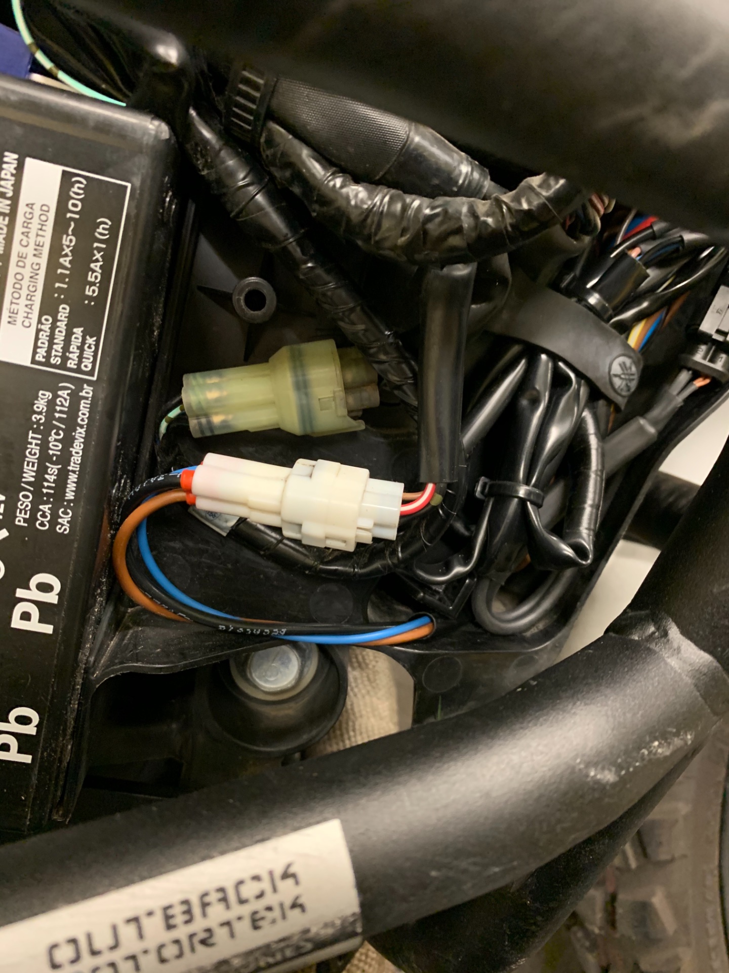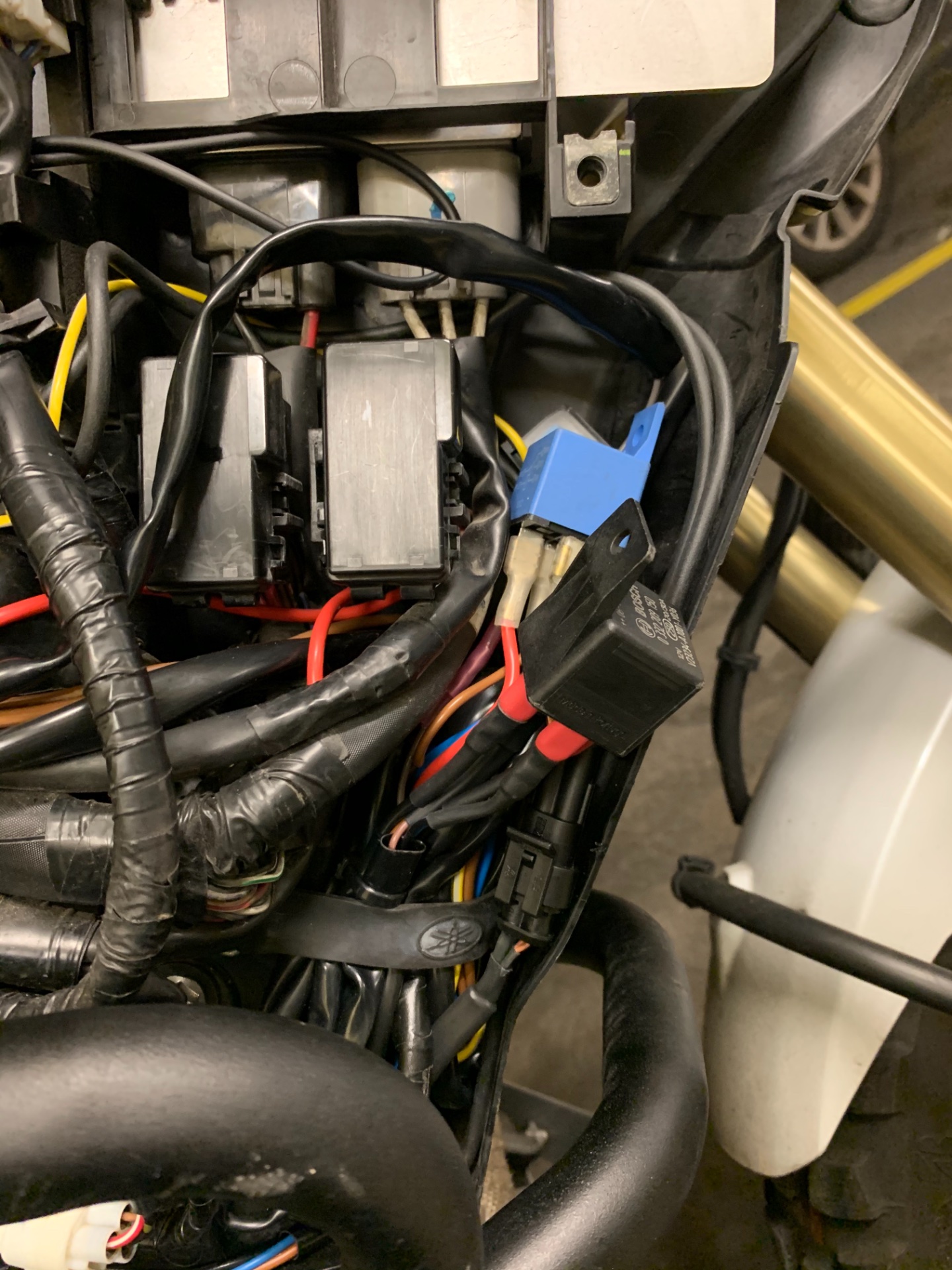 Wollte das gerne in der Nähe der "Verteilung" mitten im Zentrum der Stromzentrale, dafür hätte ich aber das halbe Motorrad mit Kabelbaum zerlegen müssen. Habe Fernlicht oben an der "Tülle" abgefangen ( gelbe Leitung auf dem Foto sichtbar) und Abblendlicht direkt am linken Relais.