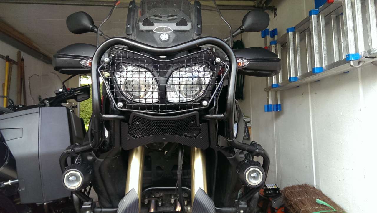 Die Touratech Blende und dann wegen dem Sturzbügel bzw. mit Gitter modifiziert...