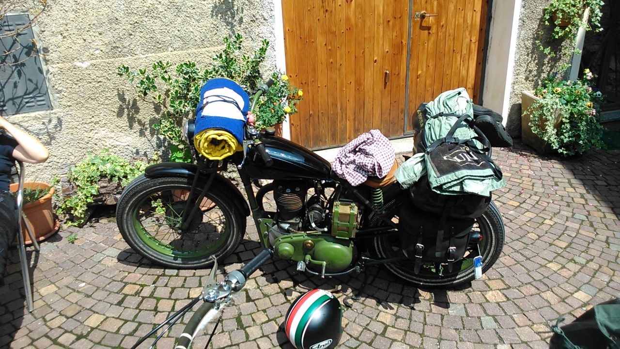 Die flicken gerade einem älteren Mann aus München den Schlauch seiner Beta Alp. Ich konnte mit Flickzeug aushelfen und habe somit endlich meine gute Tat für dieses Jahr vollbracht.