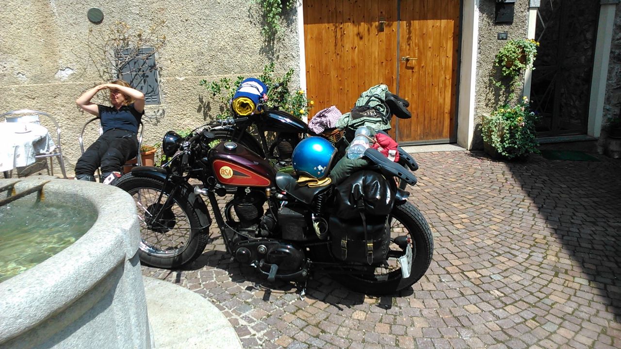 Heute nach Limone gefahren. Von da aus den Berg hoch und über einen Bogen über Tignale wieder runter an den See. Von da aus nach Gargnano den Berg hoch und dann rechts rauf bis nach Costa und wieder runter. Bei Navazzo in einer Kurve lecker Mittagessen. Waren vor Jahren schon mal da. Dann weiter zum Lago di Valvestino. In einem Bergdorf 2 Jungs mit alten BSA. M20 getroffen