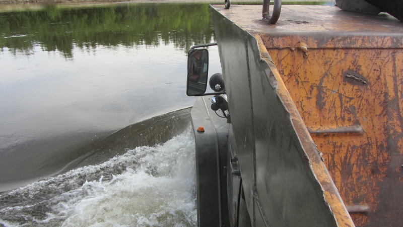 Dann beginnt die Überfahrt. Der Ural pflügt durch das Wasser, das schnell bis an die Unterkante der Ladefläche reicht, wobei der Fahrer bestimmt schon nasse Füße hat. Es ist ein wenig holprig aber sonst ist Alles gut. In der Mitte des Flusses geht es über eine Sandbank, dann noch einmal tieferes Wasser und dann eine steile Böschung hoch. Schon cool, was mit so einem Truck möglich ist. Ich glaube nicht, dass so etwas ein deutscher Trucker mit seinem MAN, Mercedes oder sonst was versuchen würde... und ich definitiv auch nicht, obwohl ich vor 30 Jahren selber mit einem §-Achser im Tiefbau unterwegs war...