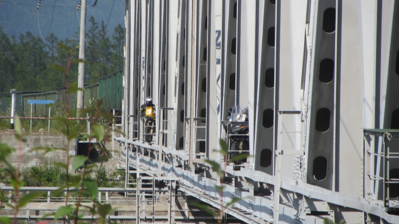 Heute stehen einige Eisenbahnbrücken auf der Agenda, nicht die kleinen, mit denen wir schon unsere Erfahrung haben, diesmal sind es größere Kastenbrücken, die nicht so einfach zu bewältigen sind. Bei der ersten, so ca. 200 m lang warten wir erst einmal einen Zug ab, der lässt sich aber reichlich Zeit, irgendwie sind heute weniger Züge unterwegs als sonst. Dann fährt Thom los und ich will hinterher, aber ich fahre mich im Schotter fest und lege die XChallenge erst einmal auf die Seite, damit sie nicht von einem Zug erfasst werden kann. John kommt zu Hilfe und wir schieben die Maschine erst einmal von der Brücke. Da das einiges an Zeit gekostet hat beschließen wir den nächsten Zug abzuwarten. So vergeht dann noch eine gute Stunde, bevor wir uns doch auf die Brücke trauen. Diesmal ohne Probleme, ich kann den „Fußweg“ nutzen und habe dabei genug Spielraum bei den Packtaschen, so dass ich problemlos an den Knotenblechen des Geländers entlang komme. Der rechte Fuß bleibt auf der Raste und mit dem linken Fuß kann ich wenn nötig auf den Schwellen halt finden.