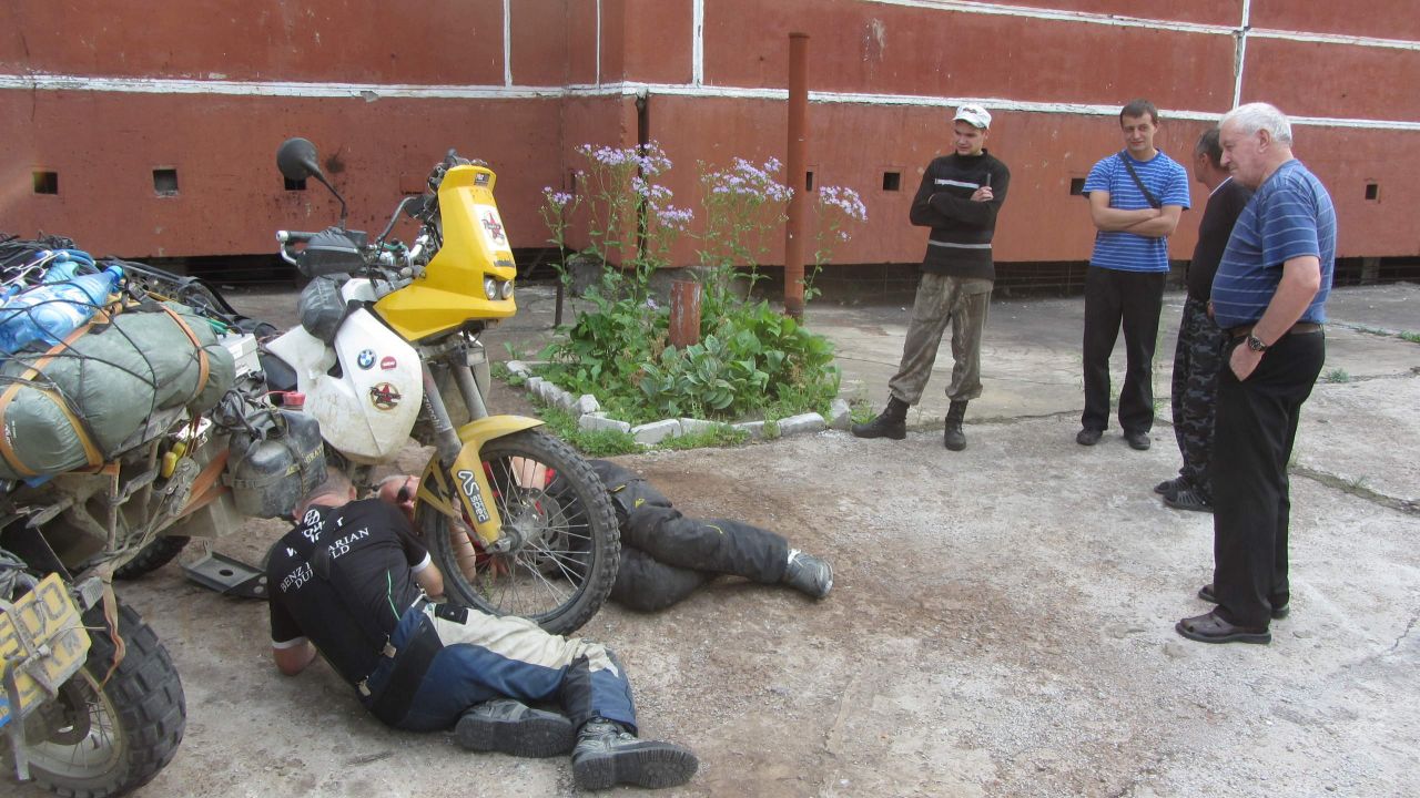 Aber wie schon gesagt, wir sind einfach Glückskinder, die Bauarbeiter haben einen Traktor. Also hin zum Vorabeiter und fragen, ob sie den Beemer Bergen können. Sie wollen uns helfen, aber das kostet 3000 Rubel. Okay, einverstanden, weil im Wasser bleiben ist keine Alternative. Zuerst versuchen wir dann, den Beemer in seine Schaufel zu bekommen, was nicht klappt, also bleibt nur ziehen über, schnell wird ein Tampen am Beemer befestigt und ganz langsam setzt sich der Schleppzug in Bewegung. John sitzt auf dem Mopped und wir halten die Maschine links und rechts fest. Wir lassen den Beemer gleich zum Lager der Bauarbeiter schleppen und dann müssen wir erst einmal Luft holen und uns Gedanken machen, wie es weiter gehen soll oder besser kann.