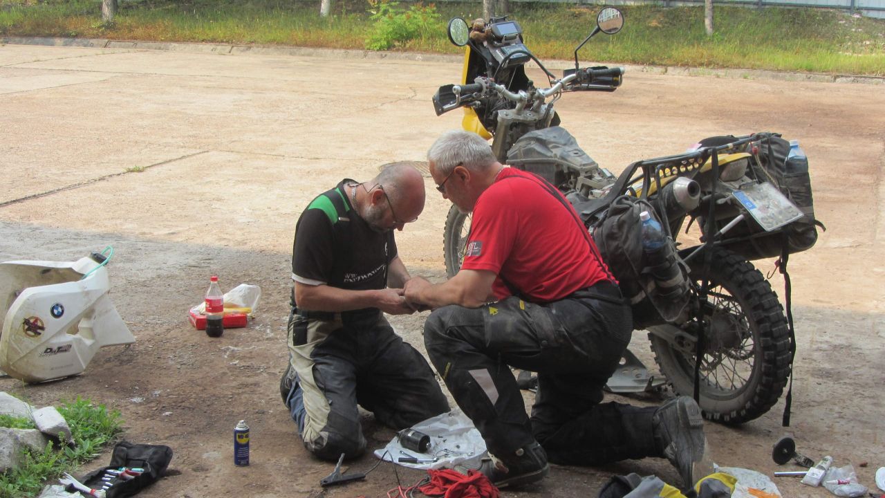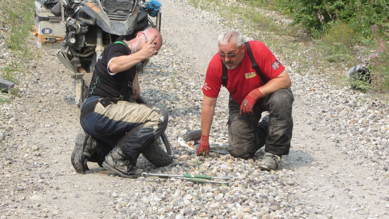 Wattn Schiet!!! Egal, erst mal soweit abrödeln, Werkzeug raus holen und den Anlasser ausbauen, um das Problem zu lokalisieren. Zum Glück stehen wir noch im Schatten und es ist noch angenehm kühl. Zusammen mit John fange ich an zu schrauben. Zum Glück lassen sich die Schrauben gut lösen, obwohl der Anlasser auf der Vorderseite vom Motor ziemlich exponiert ist und sozusagen jede Menge Dreck und Wasser abbekommen hat auf der BAM. So wie es aussieht wird wohl ein hoch geschleuderter Stein die Schraube gelockert haben. Leider lässt sich der Anlasser nicht so einfach ausbauen, obwohl alle Schrauben gelöst sind kriegen wir ihn nicht heraus gefummelt, Auspuff und Halter vom Tank sind im Weg. Also Tank runter, Halter und Auspuff lösen. Auch das geht so weit ganz gut, auch wenn es schwierig ist, an die Schrauben zu kommen. Nach knapp 2 Stunden ist der Anlasser dann draußen. Da uns langsam warm wird schicken wir Thom los, um ein paar kalte Getränke zu holen und etwas zum Essen.
