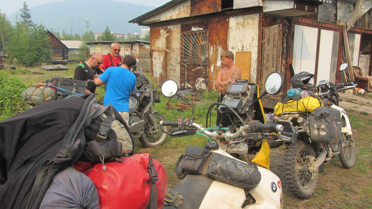 Wir müssen jetzt erst einmal sehen, dass wir hier irgendwo Benzin bekommen. Wir fahren einfach los und fragen uns durch. Doch zunächst weiß keiner wo wir Benzin bekommen. Dann halten wir ein Auto in der Nähe vom Bahnhof an, der Fahrer hat Benzin und wir sollen ihm hinterher fahren. Es geht ein bisschen durch die „Vororte“ von Yuktali und wir landen letztlich im Hof eines größeren Anwesens, wo einiges an alten Fahrzeugen rumsteht, dazu einige Gemüsebeete und Schuppen. Dann wird kurz geklärt, wie viel Benzin wir brauchen. Thom und ich nehmen jeder 15 Liter und sind damit voll, John nimmt 20 Liter und hat damit ebenfalls vollgetankt. Damit sollten wir ohne Probleme bis Tynda kommen!