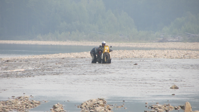 Es wird dann doch nicht der erwartete Spaziergang, die KTM hüpft und springt wegen der großen Steine, ein oder zweimal sieht es fast aus als wenn Thom umkippt aber dann schafft er doch. John und ich entscheiden dann, dass ich als Zweiter gehe, um anschließend die BMW zu Dritt über den Fluss zu bringen. Zunächst komme ich besser voran als Thom, aber dann erwische ein Loch und die XChallenge sitzt fest. John kommt zu Hilfe und mit Gewalt und kreischender Kupplung befreien wir die Maschine... Weiter geht’s, die XChallenge hüpft und bockt wie bei Thom, aber letztlich komme ich ans andere Ufer!