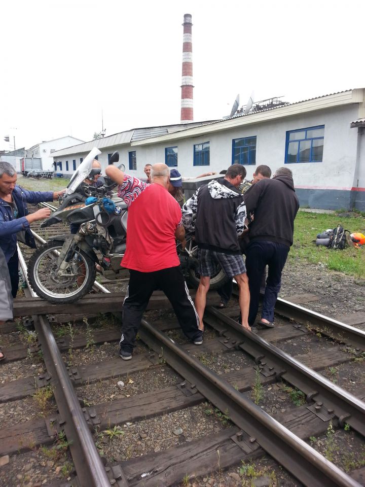 Meine Fresse, was haben wir für ein Glück! Eben noch gestrandet und jetzt quasi auf dem Weg nach Tynda. Dank der Manpower der Bahnarbeiter geht das Verladen der Moppeds wie von selbst, sogar die fette BMW wird ohne viel Federlesens auf den Plattformwagen gewuchtet.