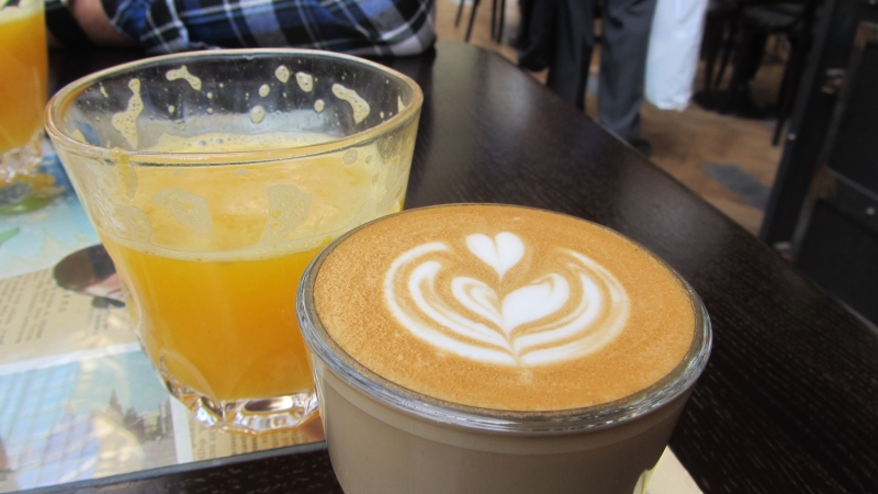 Zwar gibt es kein richtiges Frühstück im Angebot, aber wir finden trotzdem was Leckeres zu Essen, so eine Art Sandwich mit diversen Beilagen. Dazu erst einmal einen Latte Macchiato und dann Cola gegen den Durst.