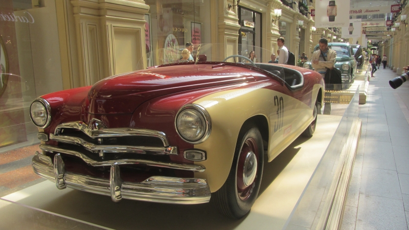 Wir setzen uns in ein Café und beobachten das bunte Treiben während wir uns den Kaffee schmecken lassen. Dann noch ein paar Schnappschüsse und dann geht’s ins Erdgeschoss, wo gerade eine Ausstellung russischer Automobile aus den vierziger und fünfziger Jahren stattfindet.