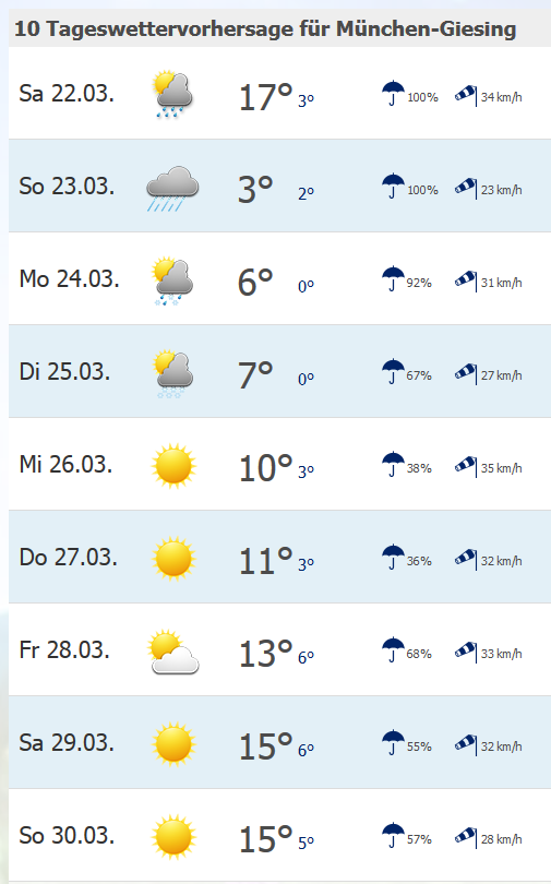 wetter.info hat schon Anfang dieser Woche gesagt, dass es bis heute schön ist, aber Samstag und Sonntag regnerisch und kalt wird. Die Woche davor war ja genauso, das haben sie auch 6 Tage vorher korrekt prognostiziert. Die Jungs machen mir fast schon ein bisschen Angst - schau mer mal, ob sie dieses Mal wieder richtig liegen.