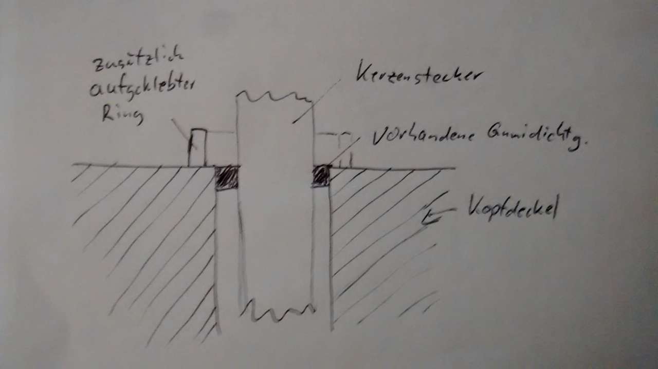 Falls das so wäre, könnte man dann ein wenige mm breiten Ring so auf der Oberfläche um die Kerzenbohrung herum so ankleben, dass zumindest das Wasser von der Kopfdeckeloberfläche nicht in die Bohrung fließen kann? Etwa so: