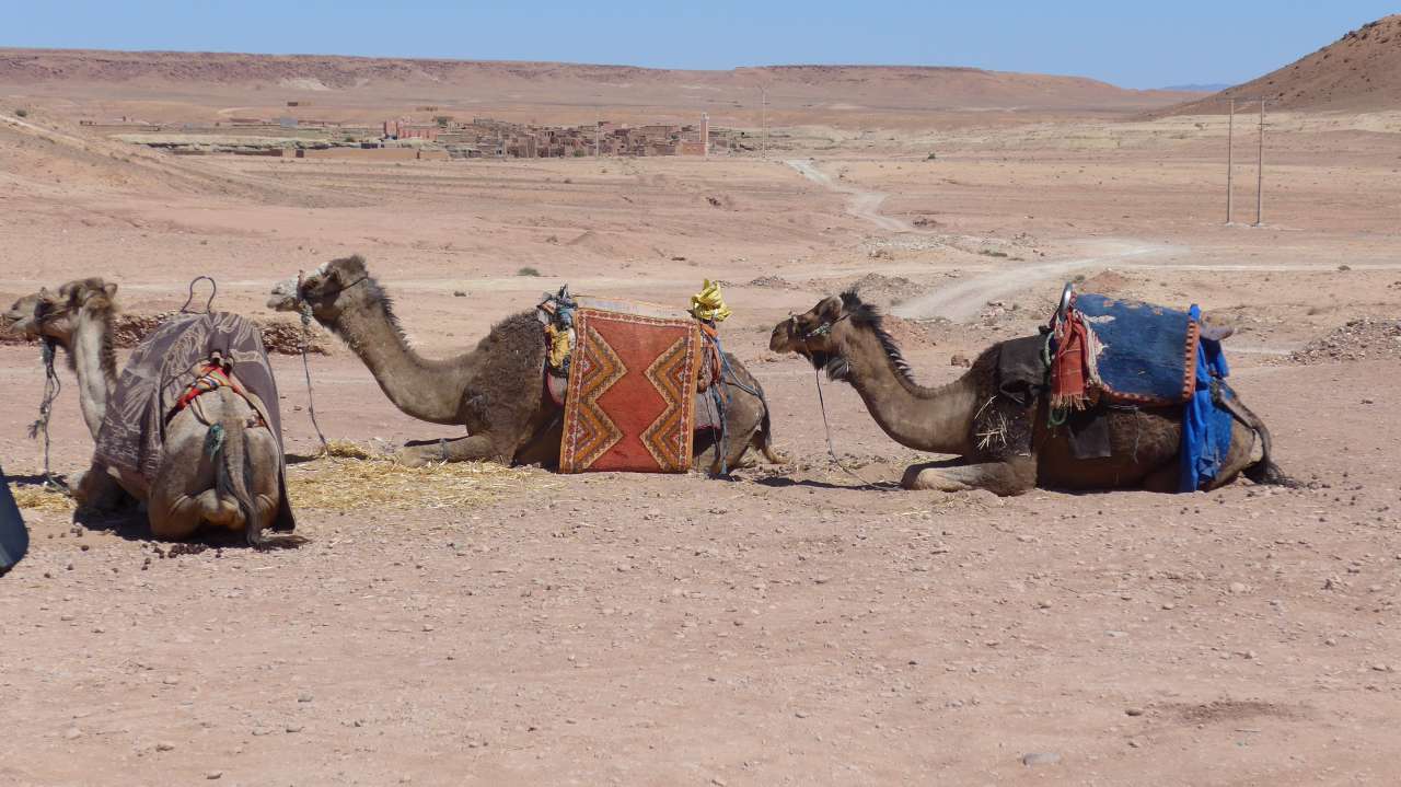 Kurz vor unserem Ziel, dem Ort Quarzazate bogen wir noch nach Aït-Ben-Haddou ab. Der Ort, heute Freilichtmuseen war Drehort des Films „Jesus von Nazareth“. Bei 34 Grad im Schatten verzichtete ich auf eine Besichtigung, wie auch alle anderen, und verbrauchte die Zeit der Pause in einer schattigen Kneipe.