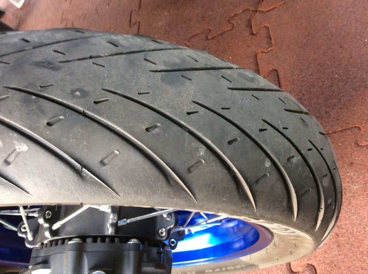 Ende April habe ich mir diese Reifenkombi aufziehen lassen. Die 320 €, die der fertig montierte Satz gekostet hat, geht für mich völlig in Ordnung. Anfang Mai haben wir damit vollgepackt einen 14 tägigen Urlaub nach Kosika unternommenen. Jetzt nach ca. 5500 km Laufleistung hat der Reifen sicherlich immer TOP funktioniert, das Laufbild enttäuscht mich aber. Der vorherige Michelin Pilot Road 4 zeigte zwar ähnlich starke Auswaschungen am Hinterreifen. Beim Roadtec01 ist dies noch deutlicher zu erkennen. Störend hat sich der Hinterreifen allerdings nicht gezeigt. Auch am Vorderrad haben sich an den Flanken starke Auswaschungem gebildet. Bis 3500 km war eigentlich alles Gut. Seitdem macht der Reifen Geräusche und vibriert vernehmlich zwischen 60 - 100 km/h. Das gefällt mir so gar nicht. Ich hoffe, dass ihr dies auf den Fotos erkennen könnt.