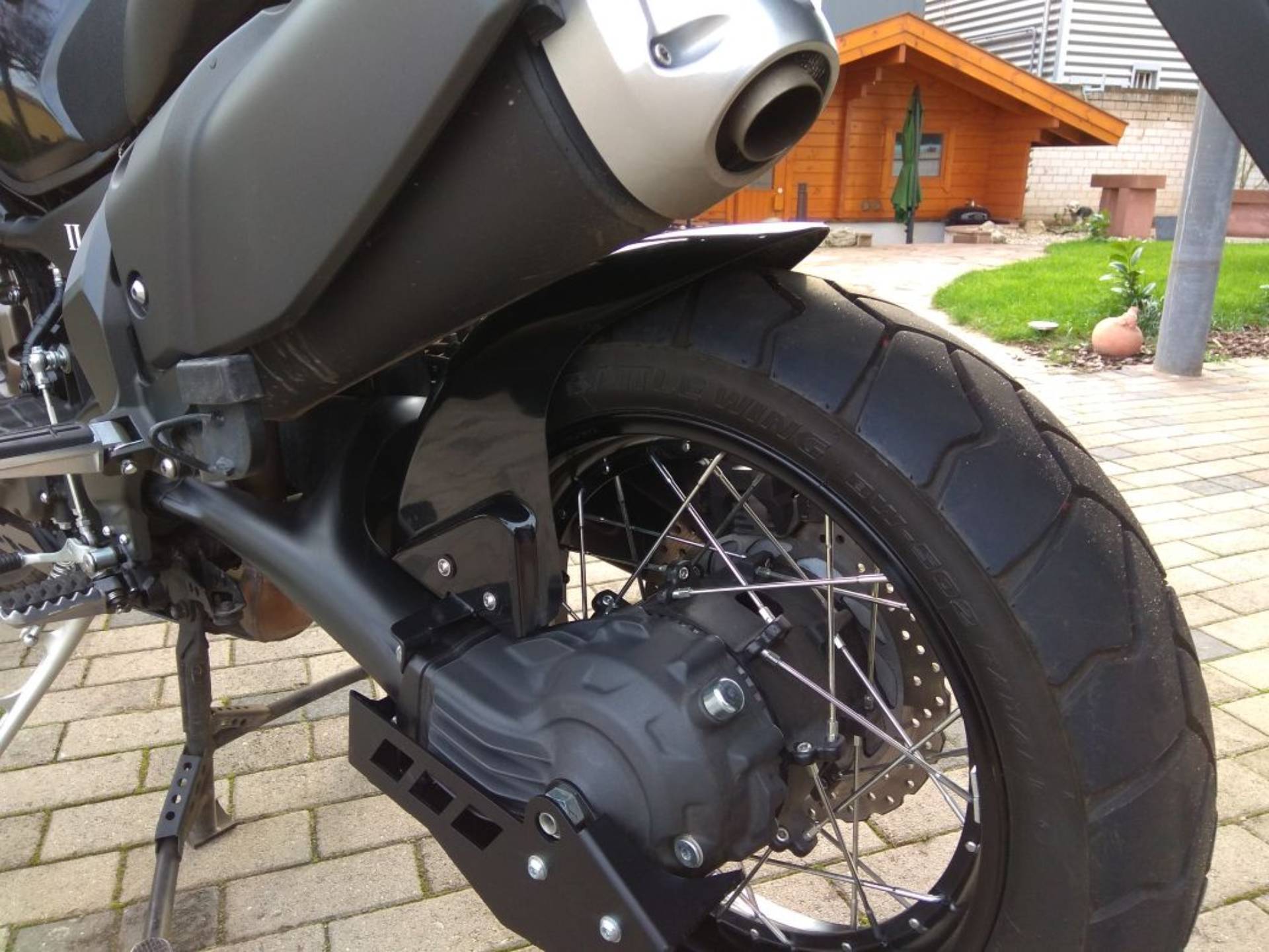 Hinterradabdeckung angebracht und die Spiegelverlängerungen sind auch angebracht.