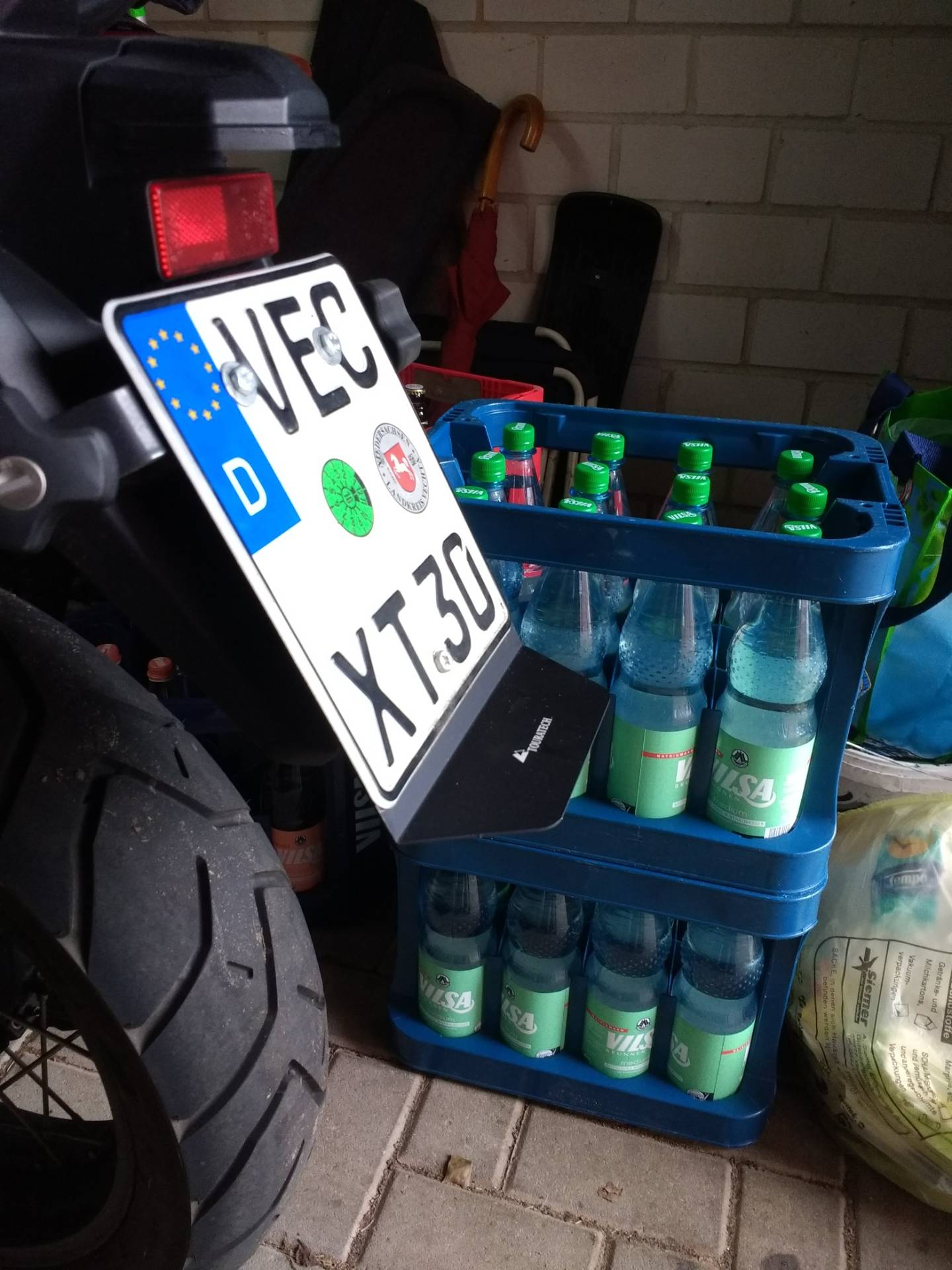 Der Spritzschutz hat einen 3M-Klebestreifen. Er wird unter das Kennzeichen auf den Kotflügel geklebt und ich habe ihn dann noch mit einer Schraube gesichert. Darüber habe ich den Kennzeichenrahmen mit dem Kennzeichen geschraubt. Hält prima und vibriert auch nicht.