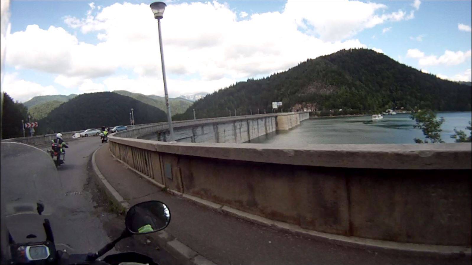 Die DN17B hatte zwei Gesichter. Zum einen gab es neu asphaltierte Streckenabschnitte und meist in den Ortschaften, die sich häuften, Betonplatten mit Teerflecken. Nach 37km erreichten wir die Brücke über das Nordende des Bicaz Stausees, an dem wir 37km entlang fuhren. Unter der Staumauer machten wir die nächste Pause. Nach Bizac waren es noch 3km. Dort wir bogen nach rechts auf die DN12C ab, um zur Bizac Klamm zu gelangen.