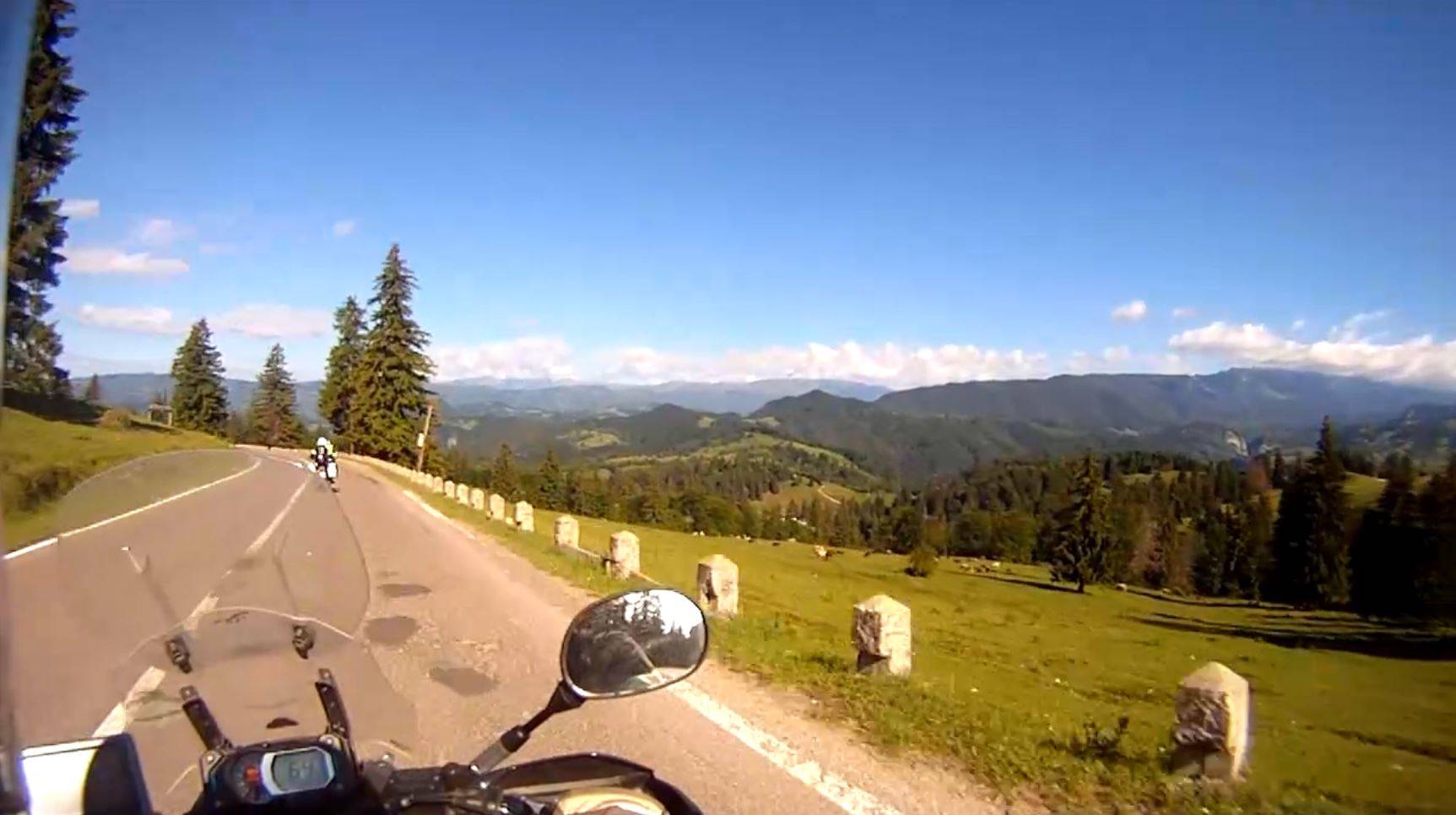 Jetzt stand aber erst einmal der Curmatura Boului Pass auf dem Programm. Sozusagen ein rumänischer Kurzstreckenpass, denn bereits nach 13km waren wir drüber. Weiter ging es entlang der DN17A zum Ciumarna Pass. Die schöne kurvenreiche Auffahrt machte mächtig Spaß. Oben am Pass angekommen wurde wieder eine kleine Pause, der schönen Aussicht wegen, eingelegt. Hatten wir bei der Auffahrt einen Bus überholt, kam dieser nun hier an und spuckte seine Fahrgäste aus, ein Heer von polnischen Touristen. Zunächst genossen auch diese die Aussicht bis eine Blondine so um die 30 Jahre uns Motorradfahrer entdeckt. Sie kam sofort zu uns rüber, schmiss sich Markus an den Hals und ließ das schön von Ihrer Freundin ablichten. Dann war ich dran. Sie warf sich so stark mit dem Rücken gegen mich, dass ich fast mit dem Moped umgefallen wäre. Ihre Freundin knipste was das Zeug hielt. Klaus und Markus starteten die Motoren, das war auch für Blondchen das Zeichen einen Schritt abzurücken. Sie war hübsch, ich hätte sie mitgenommen.