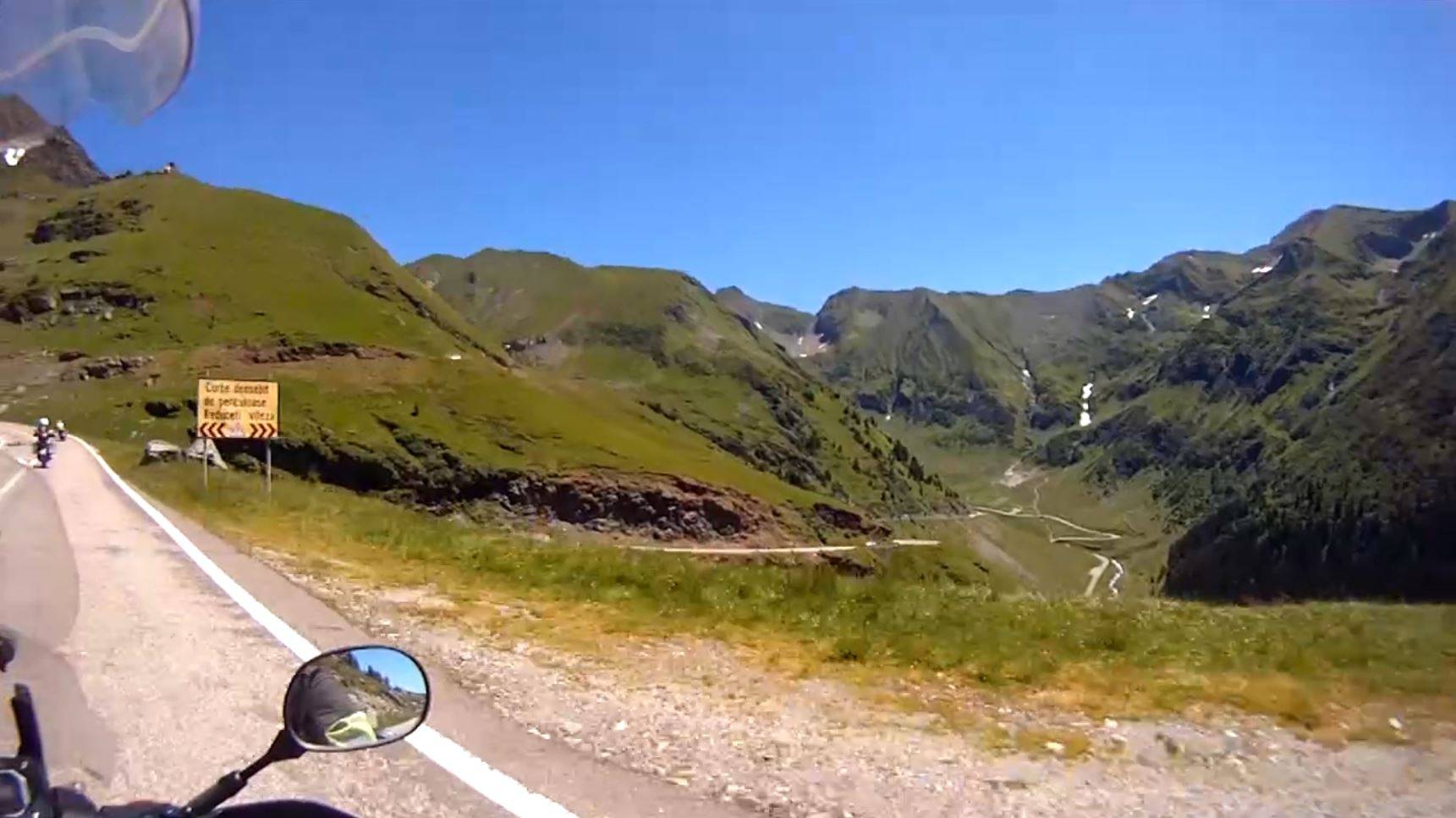 Wir bogen auf die DN73c ab und folgten dieser bis zur DN7c, dem Transfagarasan. Die DN73c war landschaftlich sehr ansprechend, viele Hügel, viele Wiesen und auch Wald prägten das Bild. Auf den ersten 21km der Transfagrasan mussten wir einen Ort nach dem anderen durchfahren. Hier griff aber das Erlernte. Mit echten 65km/h wurden wir kaum noch überholt. Auf den nächsten 6km musste ein Höhenunterschied von 200m überwunden werden, um zum Stausee zu gelangen. Die letzten Kilometer waren sehr kurvenreich und steil und machten richtig Laune. 28km folgten wir anschließend dem Ufer der Vidraru Stausee. Leider hat man nur sehr selten freien Blick auf den See, da überall Bäume rumstehen. Weiter 4km fuhren wir ohne an Höhe zu gewinnen in einem bewaldeten Tal. Immer noch auf 850m folgten wir der Straße. Wir hatten Glück, trotz des Spitzenwetters waren sehr wenige Fahrzeuge unterwegs. Jetzt erreichten wir die schönsten 24km der Südauffahrt, den eigentlichen Anstieg zum Pass. Landschaftlich ist diese Seite mit dem Col du Galibier vergleichbar.