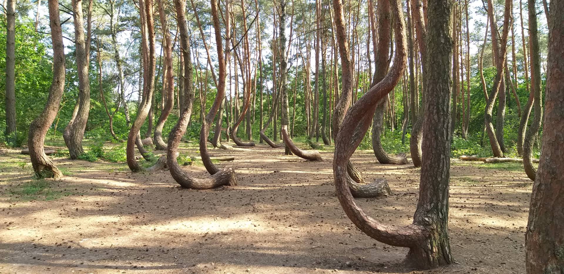 Als erstes gings erst mal nach Kolberg. Da hatte ich schon aus anderen Videos mal gesehen, dass es da so ein Militaria Gelände gibt. OK ich habe es mal gesehen, vom Sessel haut es einen nicht. Wer „Steel Buddis“ aus dem Fernsehen kennt, genauso aufgemacht, nur viel kleiner. Die alten Schüsseln rosten so vor sich hin. Bissl alten Militariaschrott zum so verkaufen, wie schon gesagt, nichts besonderes. Oben an der Küste, naja man sieht eigentlich keine Küste, nur Urlaubsdomiziele, große Hotelanlagen und Bespaßungszentren. Was die da noch an die Küste bauen, unvorstellbar. Noch mehr solche Betonsilos, einfach Wahnsinn und schade für die Natur. Die 102 geht oben parallel zur Küste, lässt sich gut fahren. Schwups, da bin ich doch schon wieder am nordwestlichsten Zipfel von Polen. Goleniow habe ich nur gestreift, aber was da an Verkehr los war, war nicht mehr feierlich - Stau, Stau. Ich habe es dann einem Mopedfahrer nachgemacht und links vorbei und mich nach vorne gemogelt. War mir in der Hitze egeal. Dann hatte ich noch einen Tip von Jörg bekommen, mir mal den krummen Wald anzuschauen. Leider hats nicht mit einem Treffen unterwegs geklappt, irgendwie ging meine PN verschütt. Nichts desto trotz, habe ich mir das Wäldchen angeschaut. Sieht schon lustig aus. Man kann nur nicht mehr hinfahren, man muss knappe 200m zu Fuß laufen.