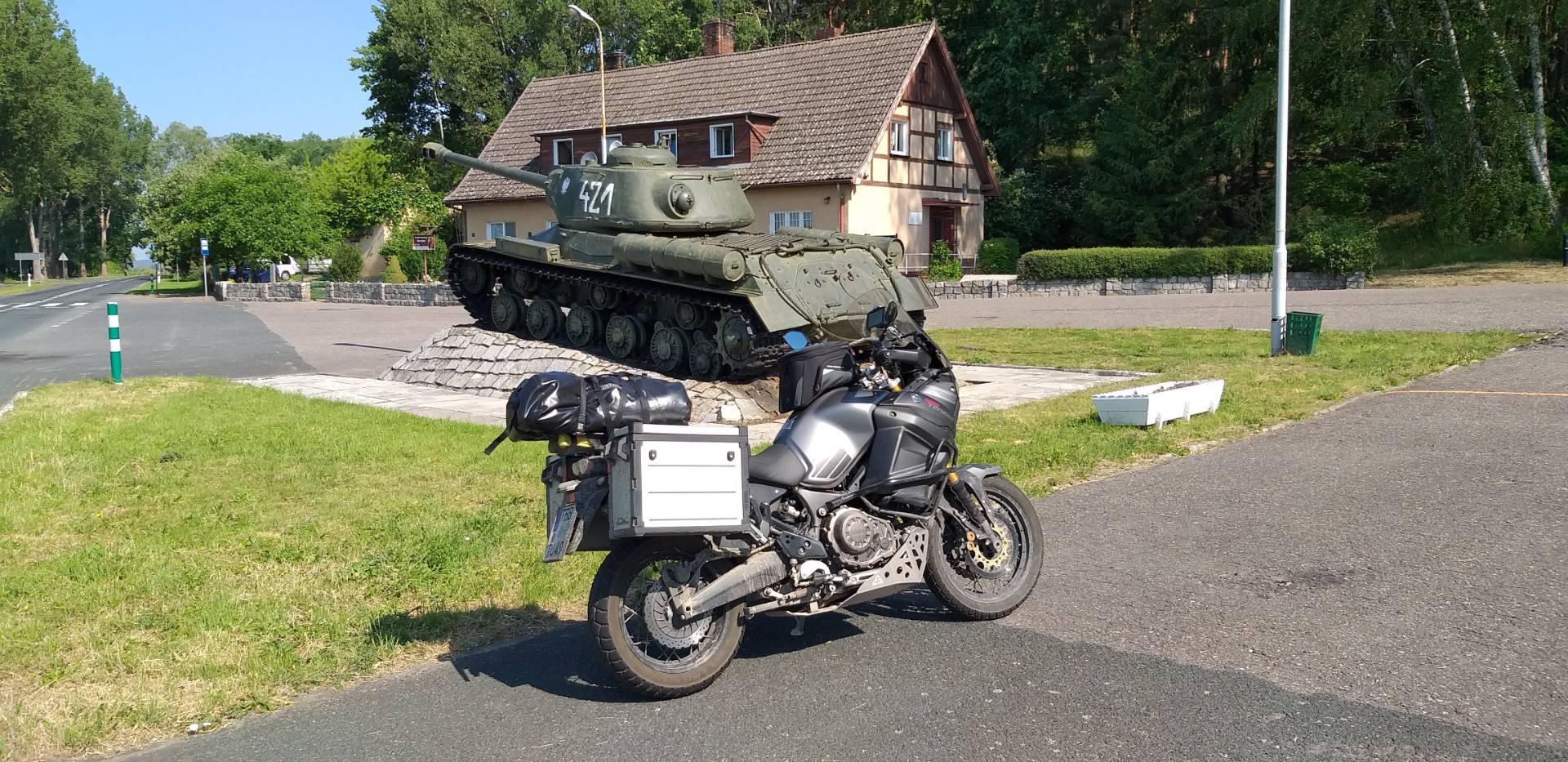 Heute hatte ich nochmal einen Mix von unterster bis oberer Straßenkategorie, also rote Nummern, auf dem Plan. Bin diesmal nicht so nah an die Grenze, sonder noch mal mehr ins Landesinnere, auch damit ich die großen Städte wie Frankfurt an der Oder umschiffe. Ein paar Denkmäler sind mir auch wieder über den Weg gelaufen. Irgend wann mal standen ein paar junge Mädels und haben mir gewunken. Ich war so frei und habe zurückgewunken. Nach ein paar Gedenkminuten ist mir der wahre Grund wie Schuppen von den Augen gefallen, Ihr wist sicherlich was ich meine. Bei Bad Muskau bin ich dann über die Grenze gewechselt und habe die deutschen Straßen genossen. Ich hatte die ganze Zeit den Ort Niesky gelesen. Mir ist partout icht eingefallen, wo ich ihn einsortieren soll. Dann stand ich auf einmal vor der Kulturinsel. Genau, daher kannte ich den Ort. Wer die Kulturinsel nicht kennt, das ist ein Spielplatz für groß uund klein. Einmal im Jahr gibt es dort das Folklorum, da geht mein Frauchen immer gern hin. Die ganze Reise hatte ich gehofft, mal so einen Grenzpfahl zu sehen. Ein paar Kilometer vorm Ziel stand plötzlich einer da. In Przewóz habe ich noch mal preiswert getankt und dann gings wieder zurück auf deutsche Seite, bis nach Zittau, dem Anfangspunkt der Reise. Blöderweise habe ich ab Zittau quer durch Tschechien ungewollt fast die exakte Tour zurück genommen. Naja, so viele Wege gibts dort nicht, also verkraftbar. Bei Zinnwald bin ich dann wieder nach Deutschland eingereist. Das Empfangskomitee stand bereit und hat mich freundlich rausgewunken. Mein erster Satz zu den 3 Jungs war: das ist jetzt nicht Euer Ernst, der Motorradfahrer muss es jetzt sein, es kommt gerade nichts besseres. Sie haben es alle mit Humor genommen, haben meine Daten durch den Fahndungscomputer laufen lassen und wir haben nebenbei nett geredet. Habe ein wenig von meiner Reise erzählt, dass ich jetzt fast 4500km gefahren bin, selbst nach Litauen hat mich keiner kontrolliert und hier werde ich so nett empfangen mit roter Kelle usw. Wie gesagt, die waren gut drauf. Der Eine wollte noch bisschen was zum Motorrad wissen, so hatten sie mal ein wenig Ablenkung. Alles gut, ich durfte weiterfahren und habe die letzten 3 km zur Unterkunft dann auch geschafft. Morgen werde ich vermutlich noch ein wenig durch die fränkische Schweiz gondeln und ab da an den Rest per Autobahn heim.