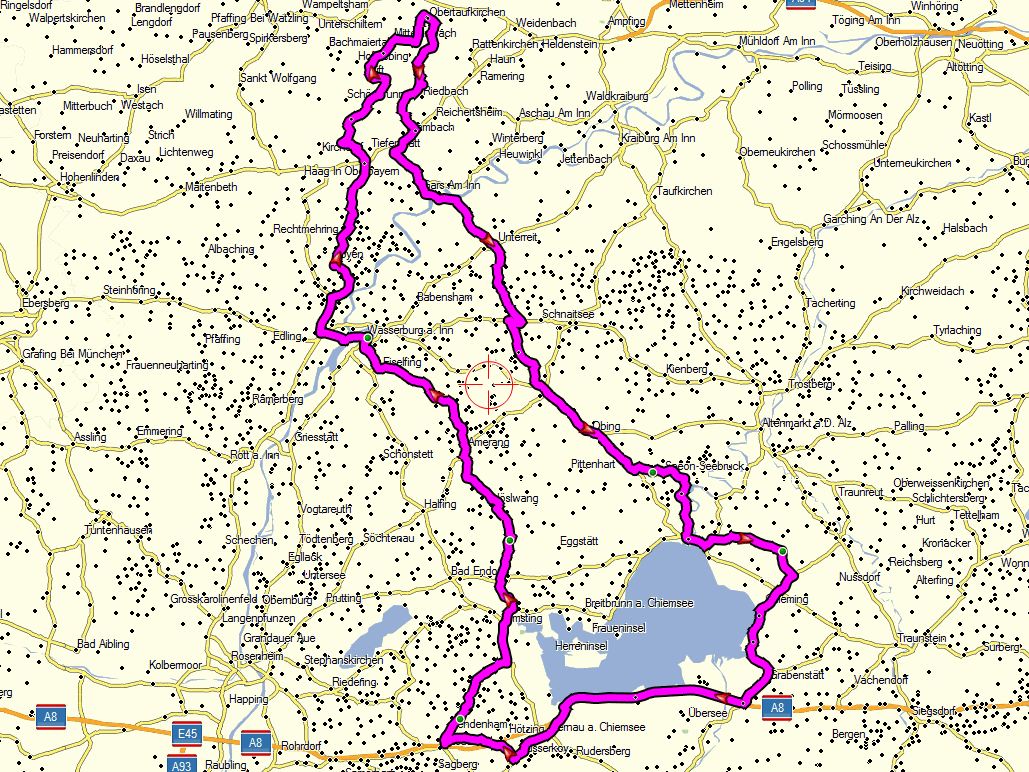Ich habe jetzt mal eine Runde von Obertaufkirchen aus zusammengeklickt. Wenn es um den Chiemsee gehen soll - was sich durchaus anbietet - wären das so jetzt 160 km und ca. 3h. Das Südufer auf der Autobahn (!) - das fand ich landschaftlich immer die schönste Strecke dort. Wer zeitlich zeitlich abkürzen will, kann einfach auf der A8 bleiben oder von Wasserburg aus Richtung Westen.