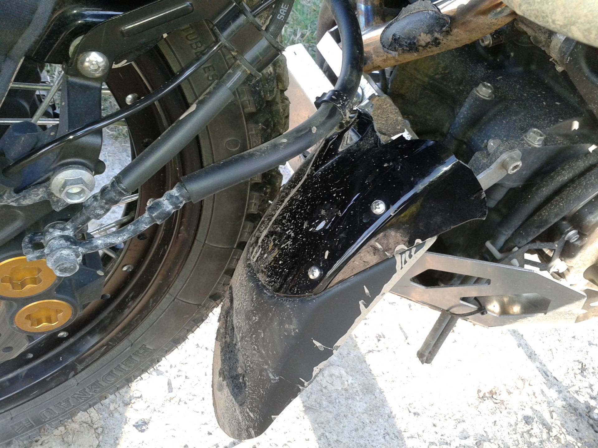 Ich habe eine Kotflügelverlängerung mit Yamaha Unterfahrschutz, und meine Action-Cam zeigte, selbst bei Vollbremsung mit ABS bleibt etwas Platz zwischen Kotflügel und Unterfahrschutz. Wobei die Verlängerung oberhalb vielleicht sogar hinter dem Unterfahrschutz zu sein schien, aber die Weitwinkel Aufnahme könnte mich täuschen.