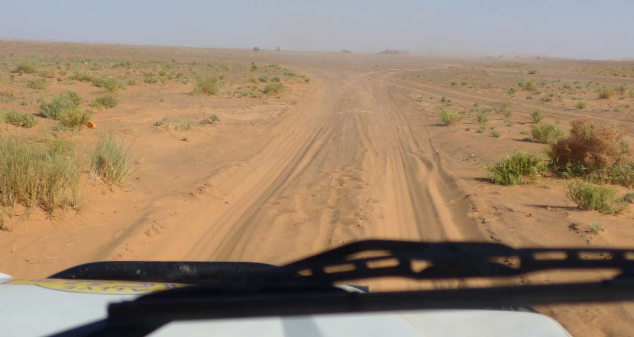 Die Fahrt ging los, aufgrund der steil stehenden Scheiben war die Sonneneinstrahlung im Innenraum halb so schlimm und die offene Lüftungsklappe im Armaturenbrett sorgte für Durchzug. Die Wahl war somit richtig. Die Straßenlage des Fahrzeugs war beängstigend, scheinbar waren noch die ersten Stoßdämpfer verbau. Nach ca. 30 Minuten erreichten wir eine Piste mit einer Mischung aus Sand und Waschbrettgeröll. Die neueren Geländewagen wurden langsamer, der Land Rover reduzierte seine Geschwindigkeit nicht und polterte über die Piste.