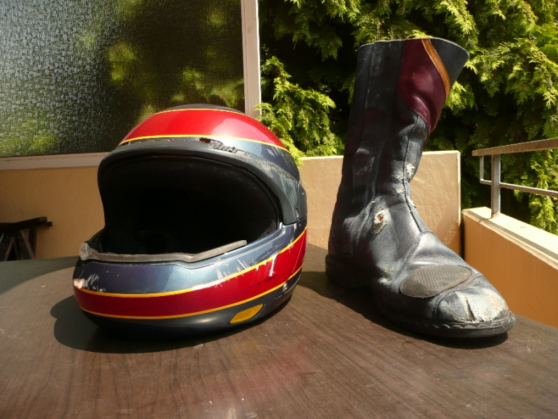Das erste Bild zeigt meinen Helm, nachdem ich 2009 nach einem Fahrfehler meinerseits aus etwa 50km/h an einer engen Landstraßenkurve nur etwa 10m ohne irgendwo anzustoßen über den Asphalt geschliddert war. Er ist vorne links und rechts stark verschabt. Ohne Kinnbügel wäre mein Kiefer wohl ziemlich onduliert gewesen ! So war das nur das Ende meines nach Eigenidee zur Lederkombi passend lackierten Helmes, wobei der keine strukturellen Schäden erlitt. Wie man sieht ist der Stiefel durchgescheuert. Die zerkratzte Lederkombi fahre ich noch immer, nachdem das Loch im Leder neben dem Knieprotektor „entfernt“ war. Die Handschuhe zeigen zwar Spuren der Mißhandlung, sind aber noch benutzbar.