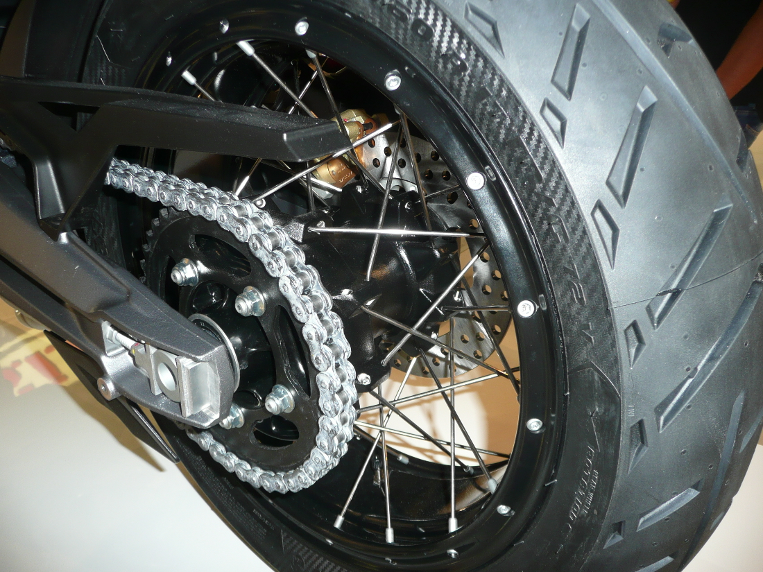 Der mit den Speichen auftrende Ärger überrascht mich etwas - hoffentlich nicht mal am eigenen Rad. Die gleiche Ausführung findet sich schon an der 650er Suzi-V-Strom, erstes Bild. Was ich an der Aprilia-Caponord gesehen habe, gefällt mir noch weit weniger: Wo sie an der Nabe wie an der ST eingehängt sind folgt sofort ein Knick. Da hat man m.E. nicht zu Ende konstruiert, zweites Bild. Am Honda Crosstourer hat man den Knick bei der Felge - auch ne