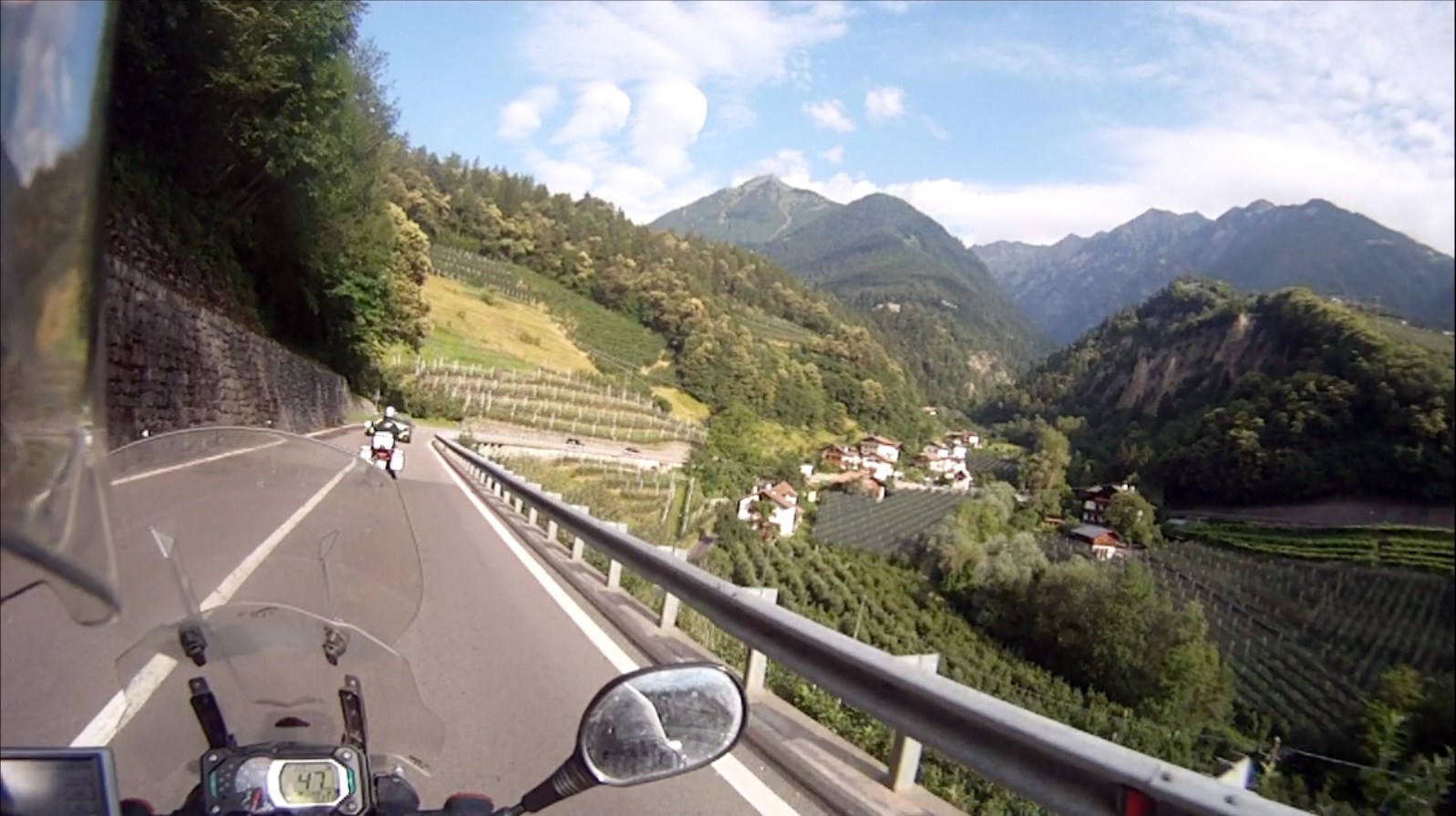 Am Gampenjoch wechselte die Landschaft und durchfuhren jetzt Wald. Das Gampenjoch war sehr zügig zu befahren, nur die immer wieder nasse Fahrbahn störte etwas. Auch um Meran war noch nichts los. Alle schliefen scheinbar noch, denn wir waren alleine unterwegs. Auf dem Weg zum Timmerlsjoch kann dann doch Verkehr auf. Diesmal aber keine Kamikazefahrer sondern voll verpennte Touristen. Ein Leipziger raste mit 30 bis 40km/h die Straßen entlang. Dann trafen wir auf eine Kolonne, die von einem Käfercabrio angeführt wurde. Entwas mühsam kämpften wir uns an allen vorbei.