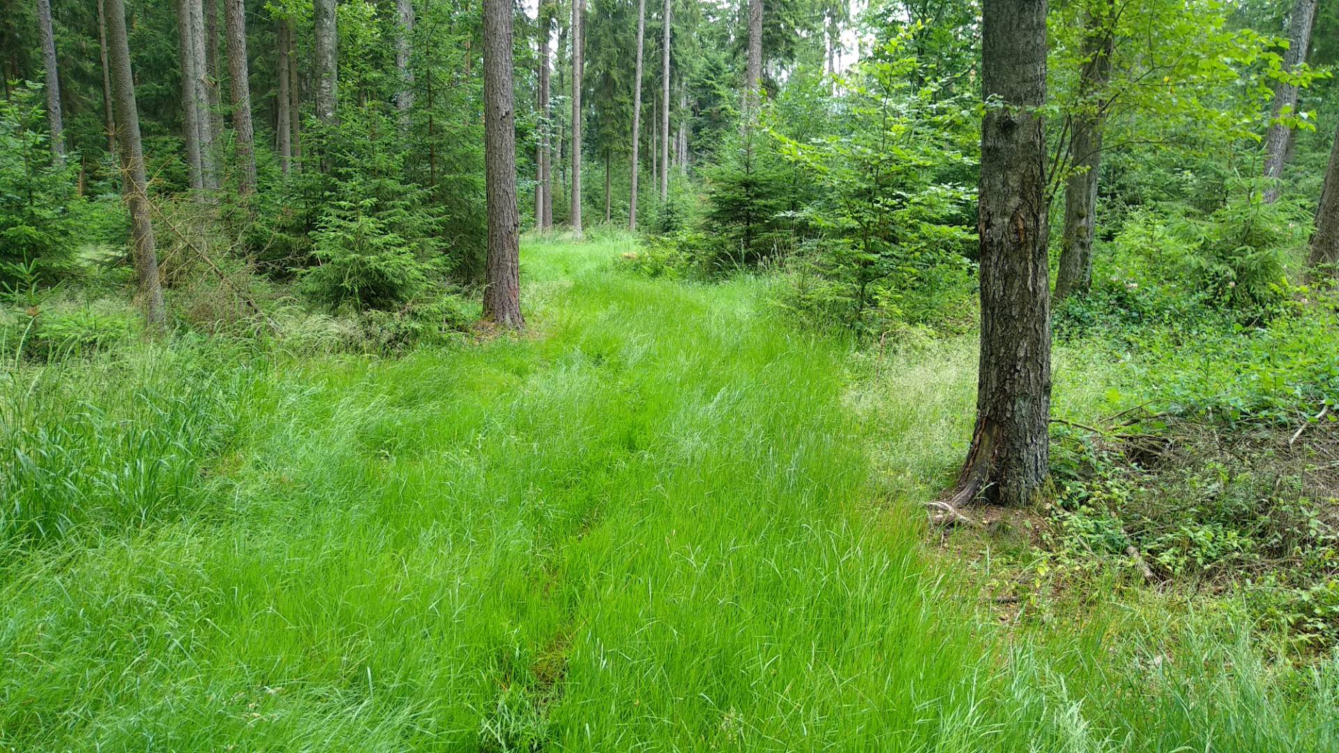 Hier sieht es auch nicht nach Waldbrandgefahr aus. Hinter der Schranke ginge es theoretisch weiter, aber die Wildsäue haben alles über den Haufen gewühlt.