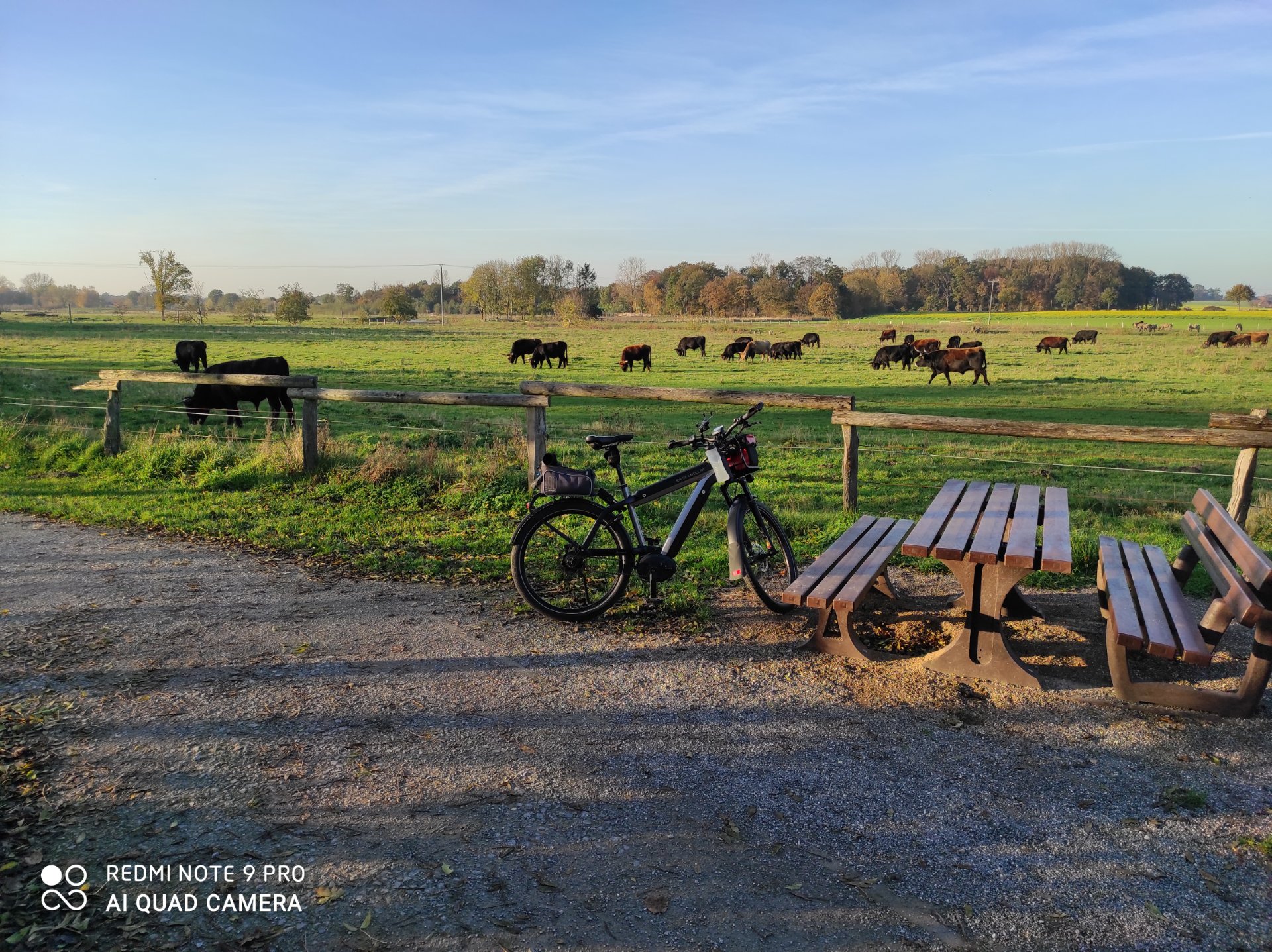 Im Hintergrund eine Herde Heckrinder, welche ihrer Arbeit als Landschaftspfleger nachgehen.